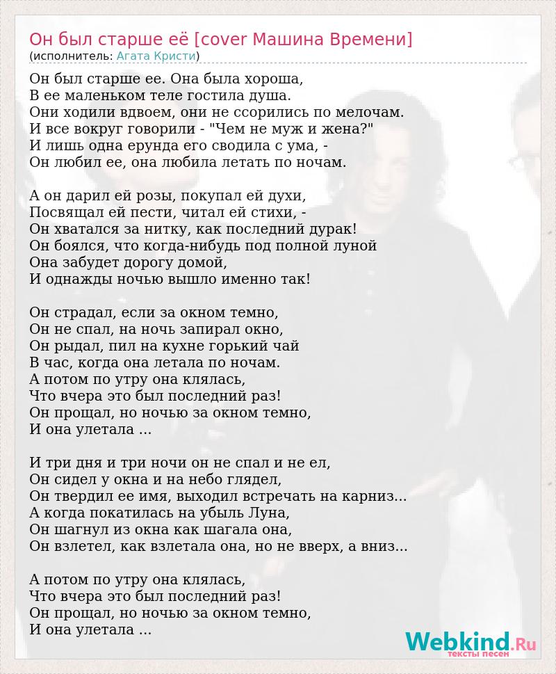 Он был старше ее. Она была хороша, В ее маленьком теле гостила душа. Они ходили вдвоем, они не ссорились по мелочам. И все вокруг говорили - "Чем не муж и жена?" И лишь одна ерунда его сводила с ума, - Он любил ее, она любила летать по ночам. А он дарил ей розы, покупал ей духи, Посвящал ей пести, читал ей стихи, - Он хватался за нитку, как последний дурак! Он боялся, что когда-нибудь под полной луной Она забудет дорогу домой, И однажды ночью вышло именно так! Он страдал, если за окном темно, Он не спал, на ночь запирал окно, Он рыдал, пил на кухне горький чай В час, когда она летала по ночам. А потом по утру она клялась, Что вчера это был последний раз! Он прощал, но ночью за окном темно, И она улетала ... И три дня и три ночи он не спал и не ел, Он сидел у окна и на небо глядел, Он твердил ее имя, выходил встречать на карниз... А когда покатилась на убыль Луна, Он шагнул из окна как шагала она, Он взлетел, как взлетала она, но не вверх, а вниз... А потом по утру она клялась, Что вчера это был последний раз! Он прощал, но ночью за окном темно, И она улетала ...