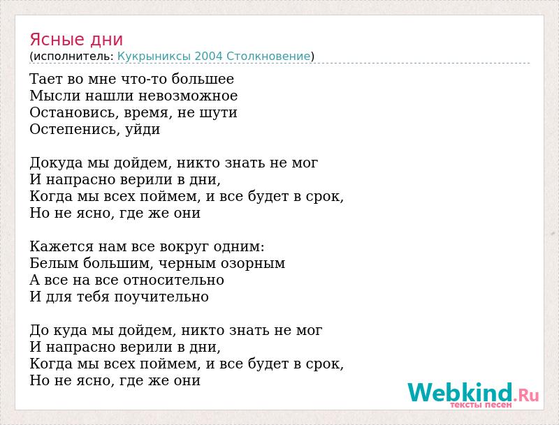 Тает во мне что-то большее Мысли нашли невозможное Остановись, время, не шути Остепенись, уйди Докуда мы дойдем, никто знать не мог И напрасно верили в дни, Когда мы всех поймем, и все будет в срок, Но не ясно, где же они Кажется нам все вокруг одним: Белым большим, черным озорным А все на все относительно И для тебя поучительно До куда мы дойдем, никто знать не мог И напрасно верили в дни, Когда мы всех поймем, и все будет в срок, Но не ясно, где же они