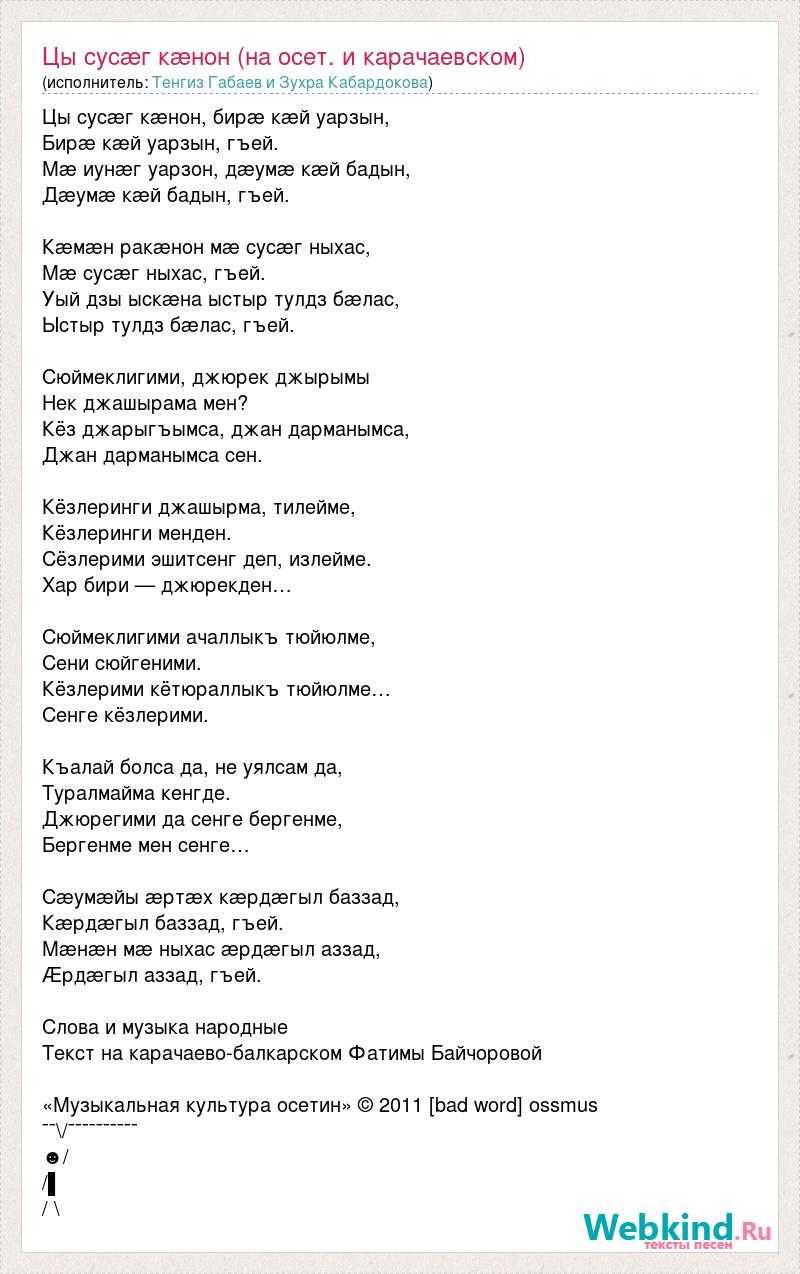 Цы сусæг кæнон, бирæ кæй уарзын, Бирæ кæй уарзын, гъей. Мæ иунæг уарзон, дæумæ кæй бадын, Дæумæ кæй бадын, гъей. Кæмæн ракæнон мæ сусæг ныхас, Мæ сусæг ныхас, гъей. Уый дзы ыскæна ыстыр тулдз бæлас, Ыстыр тулдз бæлас, гъей. Сюймеклигими, джюрек джырымы Нек джашырама мен? Кёз джарыгъымса, джан дарманымса, Джан дарманымса сен. Кёзлеринги джашырма, тилейме, Кёзлеринги менден. Сёзлерими эшитсенг деп, излейме. Хар бири — джюрекден… Сюймеклигими ачаллыкъ тюйюлме, Сени сюйгеними. Кёзлерими кётюраллыкъ тюйюлме… Сенге кёзлерими. Къалай болса да, не уялсам да, Туралмайма кенгде. Джюрегими да сенге бергенме, Бергенме мен сенге… Сæумæйы æртæх кæрдæгыл баззад, Кæрдæгыл баззад, гъей. Мæнæн мæ ныхас æрдæгыл аззад, Æрдæгыл аззад, гъей. Слова и музыка народные Текст на карачаево-балкарском Фатимы Байчоровой «Музыкальная культура осетин» © 2011 [bad word] ossmus ¯¯\/¯¯¯¯¯¯¯¯¯¯ ☻/ /▌ / \