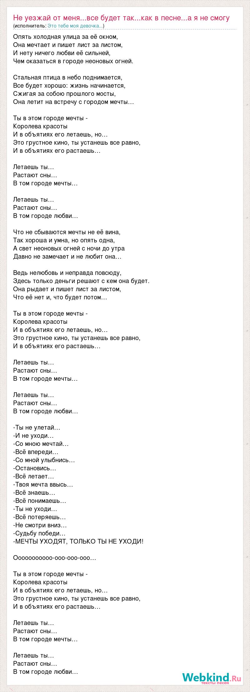 Опять холодная улица за её окном, Она мечтает и пишет лист за листом, И нету ничего любви её сильней, Чем оказаться в городе неоновых огней. Стальная птица в небо поднимается, Все будет хорошо: жизнь начинается, Сжигая за собою прошлого мосты, Она летит на встречу с городом мечты… Ты в этом городе мечты - Королева красоты И в объятиях его летаешь, но… Это грустное кино, ты устанешь все равно, И в объятиях его растаешь… Летаешь ты… Растают сны… В том городе мечты… Летаешь ты… Растают сны… В том городе любви… Что не сбываются мечты не её вина, Так хороша и умна, но опять одна, А свет неоновых огней с ночи до утра Давно не замечает и не любит она… Ведь нелюбовь и неправда повсюду, Здесь только деньги решают с кем она будет. Она рыдает и пишет лист за листом, Что её нет и, что будет потом… Ты в этом городе мечты - Королева красоты И в объятиях его летаешь, но… Это грустное кино, ты устанешь все равно, И в объятиях его растаешь… Летаешь ты… Растают сны… В том городе мечты… Летаешь ты… Растают сны… В том городе любви… -Ты не улетай… -И не уходи… -Со мною мечтай… -Всё впереди… -Со мной улыбнись… -Остановись… -Всё летает… -Твоя мечта ввысь… -Всё знаешь… -Всё понимаешь… -Ты не уходи… -Всё потеряешь… -Не смотри вниз… -Судьбу победи… -МЕЧТЫ УХОДЯТ, ТОЛЬКО ТЫ НЕ УХОДИ! Ооооооооооо-ооо-ооо-ооо… Ты в этом городе мечты - Королева красоты И в объятиях его летаешь, но… Это грустное кино, ты устанешь все равно, И в объятиях его растаешь… Летаешь ты… Растают сны… В том городе мечты… Летаешь ты… Растают сны… В том городе любви…