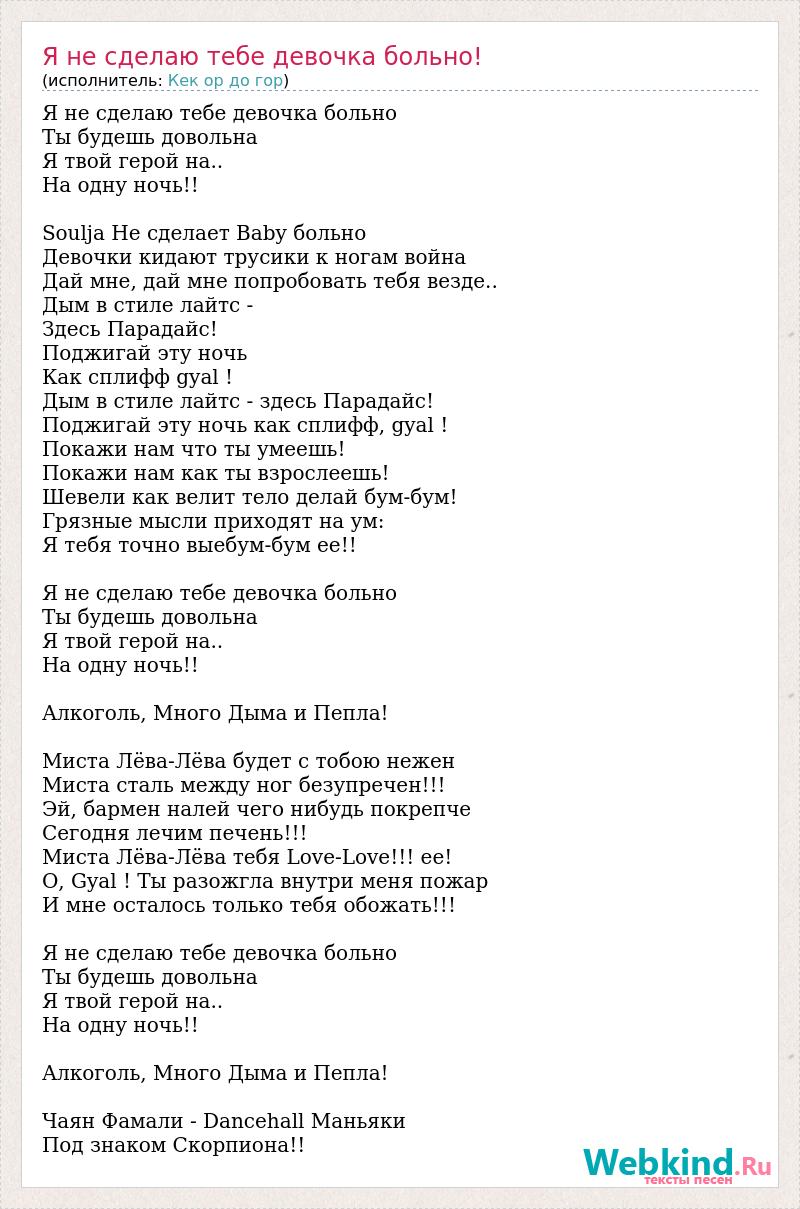 Я не сделаю тебе девочка больно Ты будешь довольна Я твой герой на.. На одну ночь!! Soulja Не сделает Baby больно Девочки кидают трусики к ногам война Дай мне, дай мне попробовать тебя везде.. Дым в стиле лайтс - Здесь Парадайс! Поджигай эту ночь Как сплифф gyal ! Дым в стиле лайтс - здесь Парадайс! Поджигай эту ночь как сплифф, gyal ! Покажи нам что ты умеешь! Покажи нам как ты взрослеешь! Шевели как велит тело делай бум-бум! Грязные мысли приходят на ум: Я тебя точно выебум-бум ее!! Я не сделаю тебе девочка больно Ты будешь довольна Я твой герой на.. На одну ночь!! Алкоголь, Много Дыма и Пепла! Миста Лёва-Лёва будет с тобою нежен Миста сталь между ног безупречен!!! Эй, бармен налей чего нибудь покрепче Сегодня лечим печень!!! Миста Лёва-Лёва тебя Love-Love!!! ее! O, Gyal ! Ты разожгла внутри меня пожар И мне осталось только тебя обожать!!! Я не сделаю тебе девочка больно Ты будешь довольна Я твой герой на.. На одну ночь!! Алкоголь, Много Дыма и Пепла! Чаян Фамали - Dancehall Маньяки Под знаком Скорпиона!!