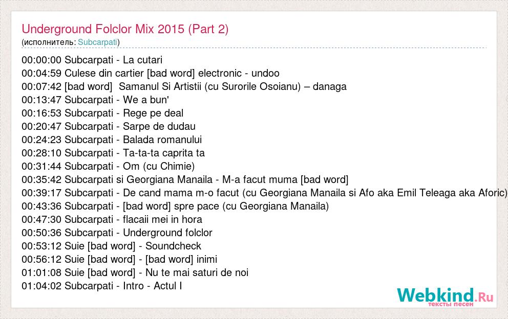 00:00:00 Subcarpati - La cutari 00:04:59 Culese din cartier [bad word] electronic - undoo 00:07:42 [bad word] Samanul Si Artistii (cu Surorile Osoianu) – danaga 00:13:47 Subcarpati - We a bun' 00:16:53 Subcarpati - Rege pe deal 00:20:47 Subcarpati - Sarpe de dudau 00:24:23 Subcarpati - Balada romanului 00:28:10 Subcarpati - Ta-ta-ta caprita ta 00:31:44 Subcarpati - Om (cu Chimie) 00:35:42 Subcarpati si Georgiana Manaila - M-a facut muma [bad word] 00:39:17 Subcarpati - De cand mama m-o facut (cu Georgiana Manaila si Afo aka Emil Teleaga aka Aforic) 00:43:36 Subcarpati - [bad word] spre pace (cu Georgiana Manaila) 00:47:30 Subcarpati - flacaii mei in hora 00:50:36 Subcarpati - Underground folclor 00:53:12 Suie [bad word] - Soundcheck 00:56:12 Suie [bad word] - [bad word] inimi 01:01:08 Suie [bad word] - Nu te mai saturi de noi 01:04:02 Subcarpati - Intro - Actul I