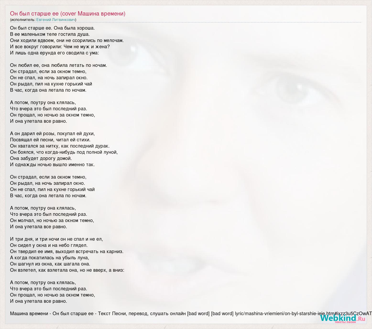 Он был старше ее. Она была хороша. В ее маленьком теле гостила душа. Они ходили вдвоем, они не ссорились по мелочам. И все вокруг говорили: Чем не муж и жена? И лишь одна ерунда его сводила с ума: Он любил ее, она любила летать по ночам. Он страдал, если за окном темно, Он не спал, на ночь запирал окно. Он рыдал, пил на кухне горький чай В час, когда она летала по ночам. А потом, поутру она клялась, Что вчера это был последний раз. Он прощал, но ночью за окном темно, И она улетала все равно. А он дарил ей розы, покупал ей духи, Посвящал ей песни, читал ей стихи. Он хватался за нитку, как последний дурак. Он боялся, что когда-нибудь под полной луной, Она забудет дорогу домой. И однажды ночью вышло именно так. Он страдал, если за окном темно, Он рыдал, на ночь запирал окно. Он не спал, пил на кухне горький чай В час, когда она летала по ночам. А потом, поутру она клялась, Что вчера это был последний раз. Он молчал, но ночью за окном темно, И она улетала все равно. И три дня, и три ночи он не спал и не ел, Он сидел у окна и на небо глядел. Он твердил ее имя, выходил встречать на карниз. А когда покатилась на убыль луна, Он шагнул из окна, как шагала она. Он взлетел, как взлетала она, но не вверх, а вниз: А потом, поутру она клялась, Что вчера это был последний раз. Он прощал, но ночью за окном темно, И она улетала все равно. Машина времени - Он был старше ее - Текст Песни, перевод, слушать онлайн [bad word] [bad word] lyric/mashina-vriemieni/on-byl-starshie-ieie.htm#ixzz3u5CzOwAT