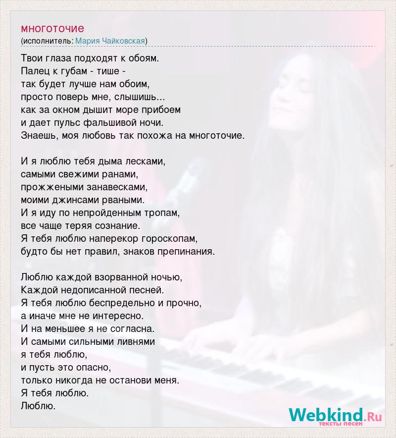 Твои глаза подходят к обоям. Палец к губам - тише - так будет лучше нам обоим, просто поверь мне, слышишь... как за окном дышит море прибоем и дает пульс фальшивой ночи. Знаешь, моя любовь так похожа на многоточие. И я люблю тебя дыма лесками, самыми свежими ранами, прожжеными занавесками, моими джинсами рваными. И я иду по непройденным тропам, все чаще теряя сознание. Я тебя люблю наперекор гороскопам, будто бы нет правил, знаков препинания. Люблю каждой взорванной ночью, Каждой недописанной песней. Я тебя люблю беспредельно и прочно, а иначе мне не интересно. И на меньшее я не согласна. И самыми сильными ливнями я тебя люблю, и пусть это опасно, только никогда не останови меня. Я тебя люблю. Люблю.