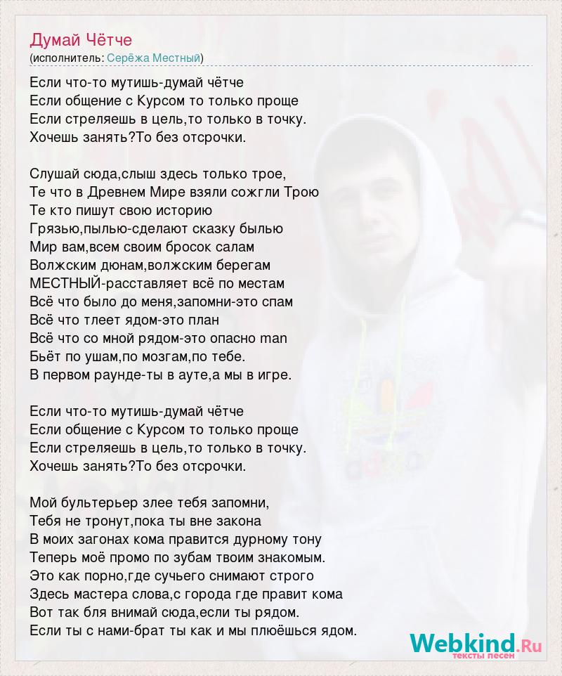 Если что-то мутишь-думай чётче Если общение с Курсом то только проще Если стреляешь в цель,то только в точку. Хочешь занять?То без отсрочки. Слушай сюда,слыш здесь только трое, Те что в Древнем Мире взяли сожгли Трою Те кто пишут свою историю Грязью,пылью-сделают сказку былью Мир вам,всем своим бросок салам Волжским дюнам,волжским берегам МЕСТНЫЙ-расставляет всё по местам Всё что было до меня,запомни-это спам Всё что тлеет ядом-это план Всё что со мной рядом-это опасно man Бьёт по ушам,по мозгам,по тебе. В первом раунде-ты в ауте,а мы в игре. Если что-то мутишь-думай чётче Если общение с Курсом то только проще Если стреляешь в цель,то только в точку. Хочешь занять?То без отсрочки. Мой бультерьер злее тебя запомни, Тебя не тронут,пока ты вне закона В моих загонах кома правится дурному тону Теперь моё промо по зубам твоим знакомым. Это как порно,где сучьего снимают строго Здесь мастера слова,с города где правит кома Вот так бля внимай сюда,если ты рядом. Если ты с нами-брат ты как и мы плюёшься ядом.