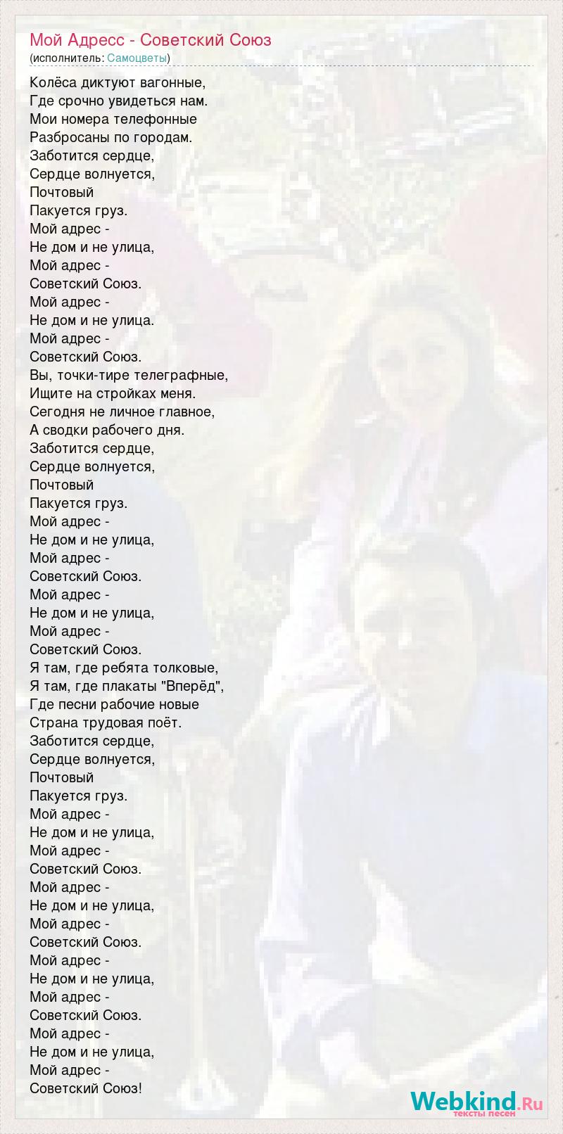 Колёса диктуют вагонные, Где срочно увидеться нам. Мои номера телефонные Разбросаны по городам. Заботится сердце, Сердце волнуется, Почтовый Пакуется груз. Мой адрес - Не дом и не улица, Мой адрес - Советский Союз. Мой адрес - Не дом и не улица. Мой адрес - Советский Союз. Вы, точки-тире телеграфные, Ищите на стройках меня. Сегодня не личное главное, А сводки рабочего дня. Заботится сердце, Сердце волнуется, Почтовый Пакуется груз. Мой адрес - Не дом и не улица, Мой адрес - Советский Союз. Мой адрес - Не дом и не улица, Мой адрес - Советский Союз. Я там, где ребята толковые, Я там, где плакаты "Вперёд", Где песни рабочие новые Страна трудовая поёт. Заботится сердце, Сердце волнуется, Почтовый Пакуется груз. Мой адрес - Не дом и не улица, Мой адрес - Советский Союз. Мой адрес - Не дом и не улица, Мой адрес - Советский Союз. Мой адрес - Не дом и не улица, Мой адрес - Советский Союз. Мой адрес - Не дом и не улица, Мой адрес - Советский Союз!