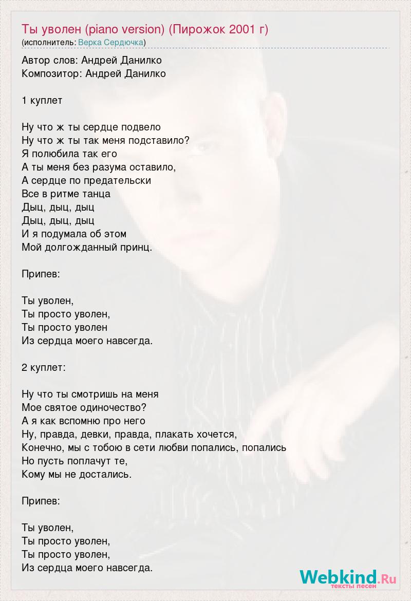 Автор слов: Андрей Данилко Композитор: Андрей Данилко 1 куплет Ну что ж ты сердце подвело Ну что ж ты так меня подставило? Я полюбила так его А ты меня без разума оставило, А сердце по предательски Все в ритме танца Дыц, дыц, дыц Дыц, дыц, дыц И я подумала об этом Мой долгожданный принц. Припев: Ты уволен, Ты просто уволен, Ты просто уволен Из сердца моего навсегда. 2 куплет: Ну что ты смотришь на меня Мое святое одиночество? А я как вспомню про него Ну, правда, девки, правда, плакать хочется, Конечно, мы с тобою в сети любви попались, попались Но пусть поплачут те, Кому мы не достались. Припев: Ты уволен, Ты просто уволен, Ты просто уволен, Из сердца моего навсегда.