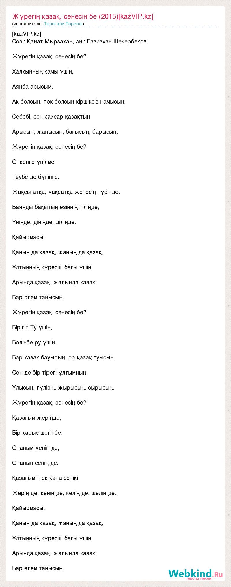 [kazVIP.kz] Сөзі: Қанат Мырзахан, әні: Ғазизхан Шекербеков. Жүрегің қазақ, сенесің бе? Халқыңның қамы үшін, Аянба арысым. Ақ болсын, пәк болсын кіршіксіз намысың. Себебі, сен қайсар қазақтың Арысың, жанысың, бағысың, барысың. Жүрегің қазақ, сенесің бе? Өткенге үңілме, Тәубе де бүгінге. Жақсы атқа, мақсатқа жетесің түбінде. Баянды бақытың өзіңнің тіліңде, Үніңде, дініңде, діліңде. Қайырмасы: Қаның да қазақ, жаның да қазақ, Ұлтыңның күресші бағы үшін. Арында қазақ, жалында қазақ Бар әлем танысын. Жүрегің қазақ, сенесің бе? Бірігіп Ту үшін, Бөлінбе ру үшін. Бар қазақ бауырың, әр қазақ туысың. Сен де бір тірегі ұлтымның Ұлысың, гүлісің, жырысың, сырысың. Жүрегің қазақ, сенесің бе? Қазағым жеріңде, Бір қарыс шегінбе. Отаным менің де, Отаның сенің де. Қазағым, тек қана сенікі Жерің де, кенің де, көлің де, шөлің де. Қайырмасы: Қаның да қазақ, жаның да қазақ, Ұлтыңның күресші бағы үшін. Арында қазақ, жалында қазақ Бар әлем танысын.