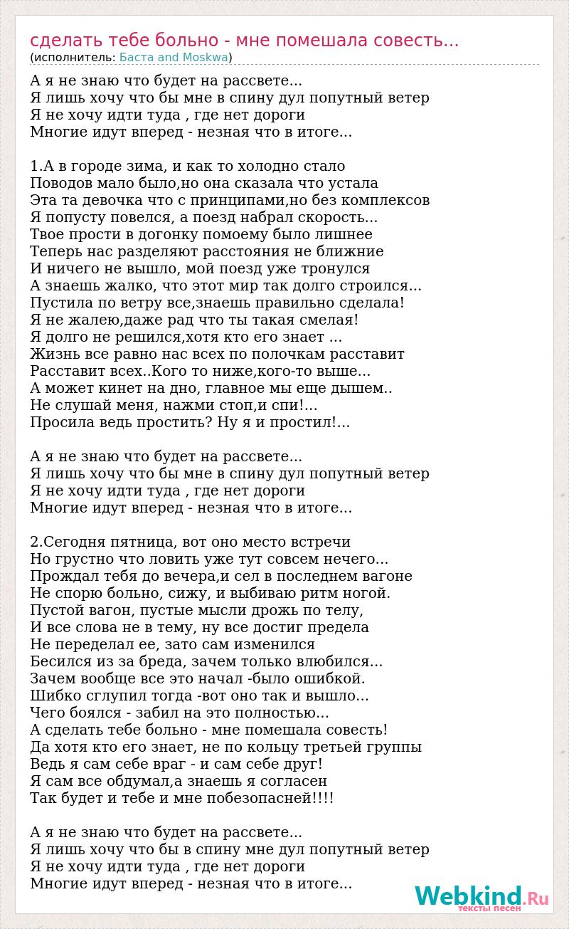А я не знаю что будет на рассвете... Я лишь хочу что бы мне в спину дул попутный ветер Я не хочу идти туда , где нет дороги Многие идут вперед - незная что в итоге... 1.А в городе зима, и как то холодно стало Поводов мало было,но она сказала что устала Эта та девочка что с принципами,но без комплексов Я попусту повелся, а поезд набрал скорость... Твое прости в догонку помоему было лишнее Теперь нас разделяют расстояния не ближние И ничего не вышло, мой поезд уже тронулся А знаешь жалко, что этот мир так долго строился... Пустила по ветру все,знаешь правильно сделала! Я не жалею,даже рад что ты такая смелая! Я долго не решился,хотя кто его знает ... Жизнь все равно нас всех по полочкам расставит Расставит всех..Кого то ниже,кого-то выше... А может кинет на дно, главное мы еще дышем.. Не слушай меня, нажми стоп,и спи!... Просила ведь простить? Ну я и простил!... А я не знаю что будет на рассвете... Я лишь хочу что бы мне в спину дул попутный ветер Я не хочу идти туда , где нет дороги Многие идут вперед - незная что в итоге... 2.Сегодня пятница, вот оно место встречи Но грустно что ловить уже тут совсем нечего... Прождал тебя до вечера,и сел в последнем вагоне Не спорю больно, сижу, и выбиваю ритм ногой. Пустой вагон, пустые мысли дрожь по телу, И все слова не в тему, ну все достиг предела Не переделал ее, зато сам изменился Бесился из за бреда, зачем только влюбился... Зачем вообще все это начал -было ошибкой. Шибко сглупил тогда -вот оно так и вышло... Чего боялся - забил на это полностью... А сделать тебе больно - мне помешала совесть! Да хотя кто его знает, не по кольцу третьей группы Ведь я сам себе враг - и сам себе друг! Я сам все обдумал,а знаешь я согласен Так будет и тебе и мне побезопасней!!!! А я не знаю что будет на рассвете... Я лишь хочу что бы в спину мне дул попутный ветер Я не хочу идти туда , где нет дороги Многие идут вперед - незная что в итоге...