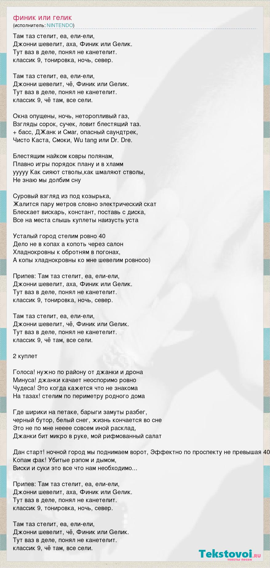 Там таз стелит, еа, ели-ели, Джонни шевелит, аха, Финик или Gелик. Тут ваз в деле, понял не канетелит. классик 9, тонировка, ночь, север. Там таз стелит, еа, ели-ели, Джонни шевелит, чё, Финик или Gелик. Тут ваз в деле, понял не канетелит. классик 9, чё там, все сели. Окна опущены, ночь, неторопливый газ, Взгляды сорок, сучек, ловит блестящий таз. + басс, ДЖанк и Смаr, опасный саундтрек, Чисто Каста, Смоки, Wu tang или Dr. Dre. Блестящим найком ковры полянам, Плавно игры порядок плану и в хламм ууууу Как сияют стволы,как шмаляют стволы, Не знаю мы долбим сну Суровый взгляд из под козырька, Жалится пару метров словно электрический скат Блескает вискарь, констант, поставь с диска, Все на места слышь куплеты наизусть уста Усталый город стелим ровно 40 Дело не в копах а копоть через салон Хладнокровны к обротням в погонах, А копы хладнокровны ко мне шевелим ровнооо) Припев: Там таз стелит, еа, ели-ели, Джонни шевелит, аха, Финик или Gелик. Тут ваз в деле, понял не канетелит. классик 9, тонировка, ночь, север. Там таз стелит, еа, ели-ели, Джонни шевелит, чё, Финик или Gелик. Тут ваз в деле, понял не канетелит. классик 9, чё там, все сели. 2 куплет Голоса! нужно по району от джанки и дрона Минуса! джанки качает неоспоримо ровно Чудеса! Это когда кажется что не знакома На тазах! стелим по периметру родного дома Где ширики на петаке, барыги замуты разбег, черный бутор, белый снег, жизнь кончается во сне Это не по мне нееее совсем иной расклад, Джанки бит микро в руке, мой рифмованный салат Дан старт! ночной город мы поднимаем ворот, Эффектно по проспекту не превышая 40 Копам фак! Убитые рэпом и дымом, Виски и суки это все что нам необходимо... Припев: Там таз стелит, еа, ели-ели, Джонни шевелит, аха, Финик или Gелик. Тут ваз в деле, понял не канетелит. классик 9, тонировка, ночь, север. Там таз стелит, еа, ели-ели, Джонни шевелит, чё, Финик или Gелик. Тут ваз в деле, понял не канетелит. классик 9, чё там, все сели.
