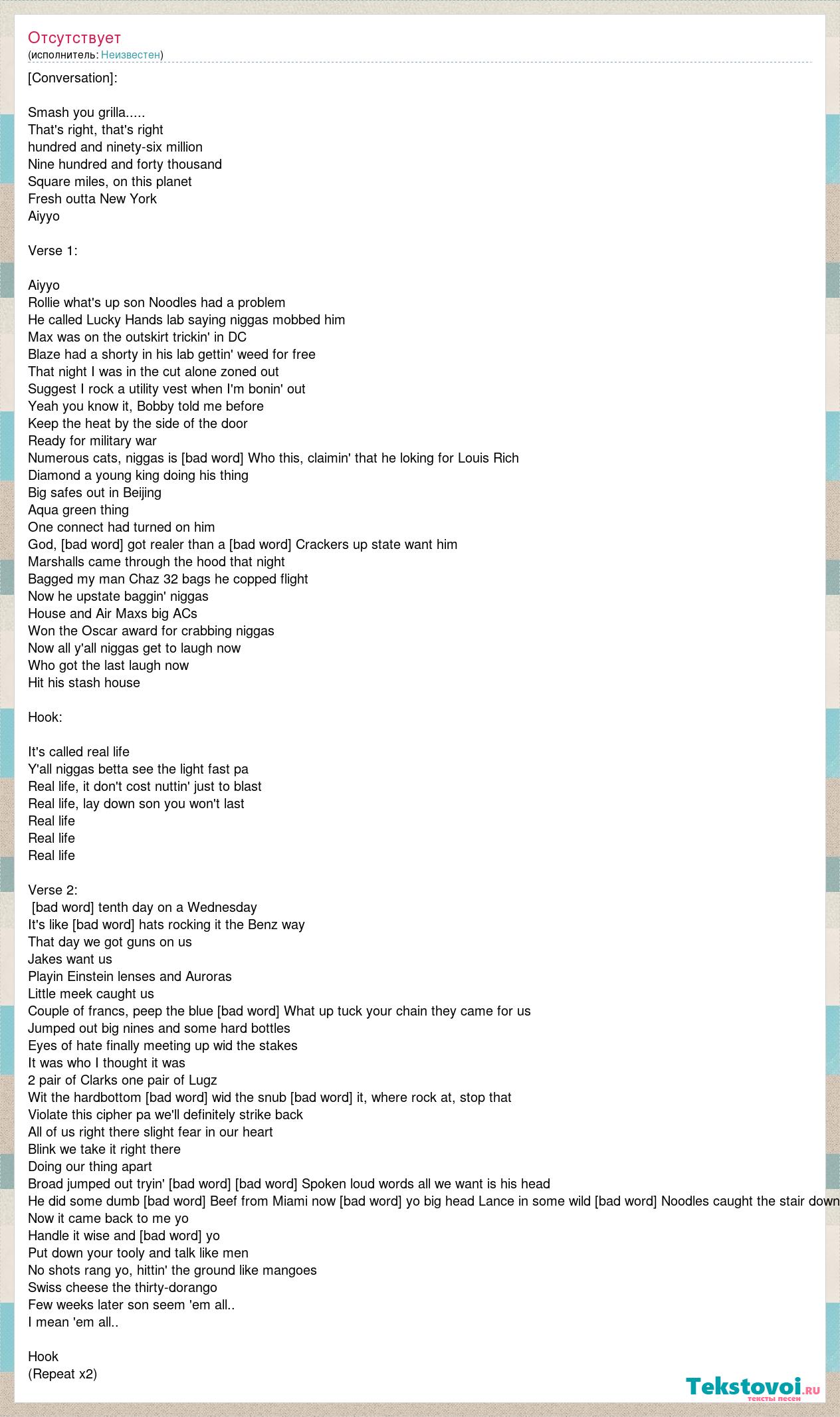 [Conversation]: Smash you grilla..... That's right, that's right hundred and ninety-six million Nine hundred and forty thousand Square miles, on this planet Fresh outta New York Aiyyo Verse 1: Aiyyo Rollie what's up son Noodles had a problem He called Lucky Hands lab saying niggas mobbed him Max was on the outskirt trickin' in DC Blaze had a shorty in his lab gettin' weed for free That night I was in the cut alone zoned out Suggest I rock a utility vest when I'm bonin' out Yeah you know it, Bobby told me before Keep the heat by the side of the door Ready for military war Numerous cats, niggas is [bad word] Who this, claimin' that he loking for Louis Rich Diamond a young king doing his thing Big safes out in Beijing Aqua green thing One connect had turned on him God, [bad word] got realer than a [bad word] Crackers up state want him Marshalls came through the hood that night Bagged my man Chaz 32 bags he copped flight Now he upstate baggin' niggas House and Air Maxs big ACs Won the Oscar award for crabbing niggas Now all y'all niggas get to laugh now Who got the last laugh now Hit his stash house Hook: It's called real life Y'all niggas betta see the light fast pa Real life, it don't cost nuttin' just to blast Real life, lay down son you won't last Real life Real life Real life Verse 2: [bad word] tenth day on a Wednesday It's like [bad word] hats rocking it the Benz way That day we got guns on us Jakes want us Playin Einstein lenses and Auroras Little meek caught us Couple of francs, peep the blue [bad word] What up tuck your chain they came for us Jumped out big nines and some hard bottles Eyes of hate finally meeting up wid the stakes It was who I thought it was 2 pair of Clarks one pair of Lugz Wit the hardbottom [bad word] wid the snub [bad word] it, where rock at, stop that Violate this cipher pa we'll definitely strike back All of us right there slight fear in our heart Blink we take it right there Doing our thing apart Broad jumped out tryin' [bad word] [bad word] Spoken loud words all we want is his head He did some dumb [bad word] Beef from Miami now [bad word] yo big head Lance in some wild [bad word] Noodles caught the stair down Now it came back to me yo Handle it wise and [bad word] yo Put down your tooly and talk like men No shots rang yo, hittin' the ground like mangoes Swiss cheese the thirty-dorango Few weeks later son seem 'em all.. I mean 'em all.. Hook (Repeat x2)