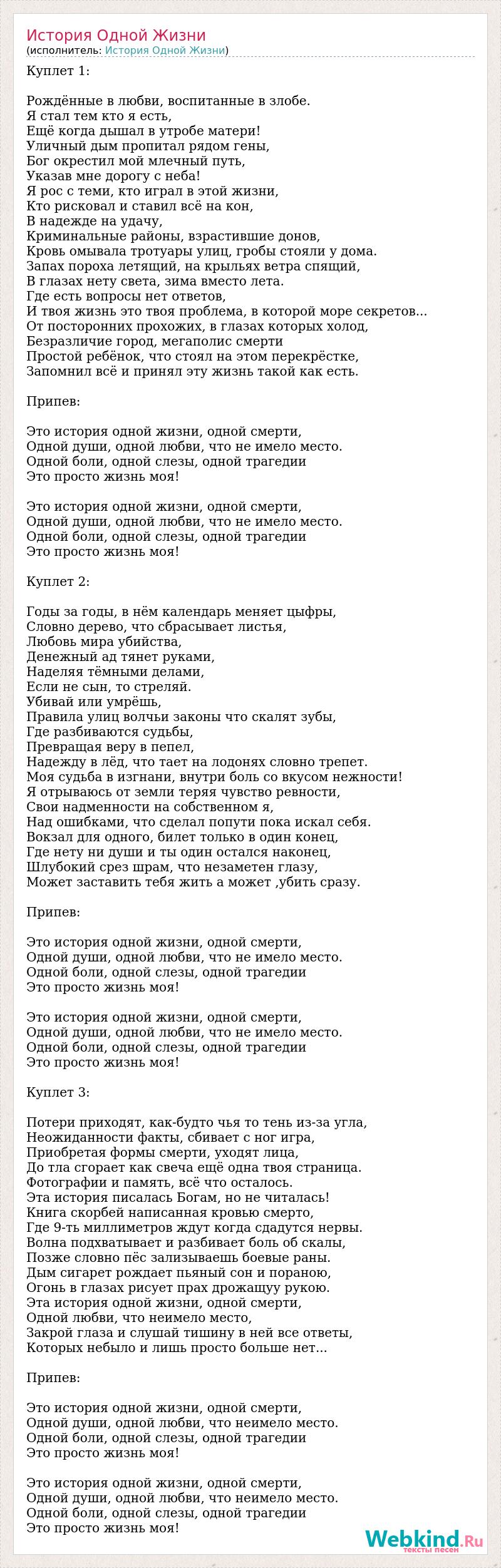 Куплет 1: Рождённые в любви, воспитанные в злобе. Я стал тем кто я есть, Ещё когда дышал в утробе матери! Уличный дым пропитал рядом гены, Бог окрестил мой млечный путь, Указав мне дорогу с неба! Я рос с теми, кто играл в этой жизни, Кто рисковал и ставил всё на кон, В надежде на удачу, Криминальные районы, взрастившие донов, Кровь омывала тротуары улиц, гробы стояли у дома. Запах пороха летящий, на крыльях ветра спящий, В глазах нету света, зима вместо лета. Где есть вопросы нет ответов, И твоя жизнь это твоя проблема, в которой море секретов... От посторонних прохожих, в глазах которых холод, Безразличие город, мегаполис смерти Простой ребёнок, что стоял на этом перекрёстке, Запомнил всё и принял эту жизнь такой как есть. Припев: Это история одной жизни, одной смерти, Одной души, одной любви, что не имело место. Одной боли, одной слезы, одной трагедии Это просто жизнь моя! Это история одной жизни, одной смерти, Одной души, одной любви, что не имело место. Одной боли, одной слезы, одной трагедии Это просто жизнь моя! Куплет 2: Годы за годы, в нём календарь меняет цыфры, Словно дерево, что сбрасывает листья, Любовь мира убийства, Денежный ад тянет руками, Наделяя тёмными делами, Если не сын, то стреляй. Убивай или умрёшь, Правила улиц волчьи законы что скалят зубы, Где разбиваются судьбы, Превращая веру в пепел, Надежду в лёд, что тает на лодонях словно трепет. Моя судьба в изгнани, внутри боль со вкусом нежности! Я отрываюсь от земли теряя чувство ревности, Свои надменности на собственном я, Над ошибками, что сделал попути пока искал себя. Вокзал для одного, билет только в один конец, Где нету ни души и ты один остался наконец, Шлубокий срез шрам, что незаметен глазу, Может заставить тебя жить а может ,убить сразу. Припев: Это история одной жизни, одной смерти, Одной души, одной любви, что не имело место. Одной боли, одной слезы, одной трагедии Это просто жизнь моя! Это история одной жизни, одной смерти, Одной души, одной любви, что не имело место. Одной боли, одной слезы, одной трагедии Это просто жизнь моя! Куплет 3: Потери приходят, как-будто чья то тень из-за угла, Неожиданности факты, сбивает с ног игра, Приобретая формы смерти, уходят лица, До тла сгорает как свеча ещё одна твоя страница. Фотографии и память, всё что осталось. Эта история писалась Богам, но не читалась! Книга скорбей написанная кровью смерто, Где 9-ть миллиметров ждут когда сдадутся нервы. Волна подхватывает и разбивает боль об скалы, Позже словно пёс зализываешь боевые раны. Дым сигарет рождает пьяный сон и пораною, Огонь в глазах рисует прах дрожащуу рукою. Эта история одной жизни, одной смерти, Одной любви, что неимело место, Закрой глаза и слушай тишину в ней все ответы, Которых небыло и лишь просто больше нет... Припев: Это история одной жизни, одной смерти, Одной души, одной любви, что неимело место. Одной боли, одной слезы, одной трагедии Это просто жизнь моя! Это история одной жизни, одной смерти, Одной души, одной любви, что неимело место. Одной боли, одной слезы, одной трагедии Это просто жизнь моя!