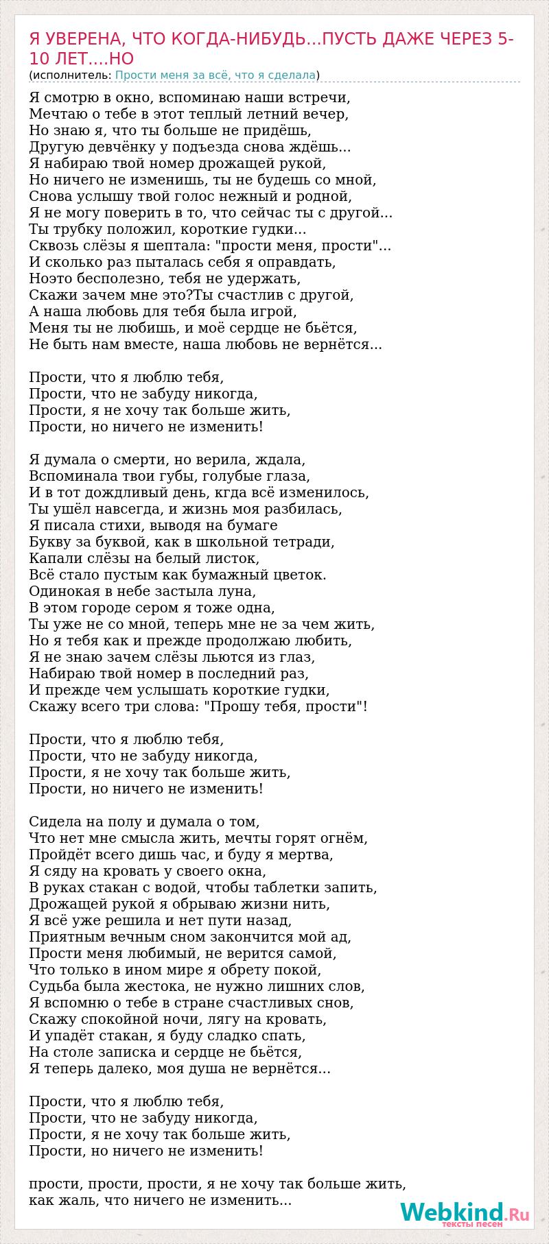 Я смотрю в окно, вспоминаю наши встречи, Мечтаю о тебе в этот теплый летний вечер, Но знаю я, что ты больше не придёшь, Другую девчёнку у подъезда снова ждёшь... Я набираю твой номер дрожащей рукой, Но ничего не изменишь, ты не будешь со мной, Снова услышу твой голос нежный и родной, Я не могу поверить в то, что сейчас ты с другой... Ты трубку положил, короткие гудки... Сквозь слёзы я шептала: "прости меня, прости"... И сколько раз пыталась себя я оправдать, Ноэто бесполезно, тебя не удержать, Скажи зачем мне это?Ты счастлив с другой, А наша любовь для тебя была игрой, Меня ты не любишь, и моё сердце не бьётся, Не быть нам вместе, наша любовь не вернётся... Прости, что я люблю тебя, Прости, что не забуду никогда, Прости, я не хочу так больше жить, Прости, но ничего не изменить! Я думала о смерти, но верила, ждала, Вспоминала твои губы, голубые глаза, И в тот дождливый день, кгда всё изменилось, Ты ушёл навсегда, и жизнь моя разбилась, Я писала стихи, выводя на бумаге Букву за буквой, как в школьной тетради, Капали слёзы на белый листок, Всё стало пустым как бумажный цветок. Одинокая в небе застыла луна, В этом городе сером я тоже одна, Ты уже не со мной, теперь мне не за чем жить, Но я тебя как и прежде продолжаю любить, Я не знаю зачем слёзы льются из глаз, Набираю твой номер в последний раз, И прежде чем услышать короткие гудки, Скажу всего три слова: "Прошу тебя, прости"! Прости, что я люблю тебя, Прости, что не забуду никогда, Прости, я не хочу так больше жить, Прости, но ничего не изменить! Сидела на полу и думала о том, Что нет мне смысла жить, мечты горят огнём, Пройдёт всего дишь час, и буду я мертва, Я сяду на кровать у своего окна, В руках стакан с водой, чтобы таблетки запить, Дрожащей рукой я обрываю жизни нить, Я всё уже решила и нет пути назад, Приятным вечным сном закончится мой ад, Прости меня любимый, не верится самой, Что только в ином мире я обрету покой, Судьба была жестока, не нужно лишних слов, Я вспомню о тебе в стране счастливых снов, Скажу спокойной ночи, лягу на кровать, И упадёт стакан, я буду сладко спать, На столе записка и сердце не бьётся, Я теперь далеко, моя душа не вернётся... Прости, что я люблю тебя, Прости, что не забуду никогда, Прости, я не хочу так больше жить, Прости, но ничего не изменить! прости, прости, прости, я не хочу так больше жить, как жаль, что ничего не изменить...