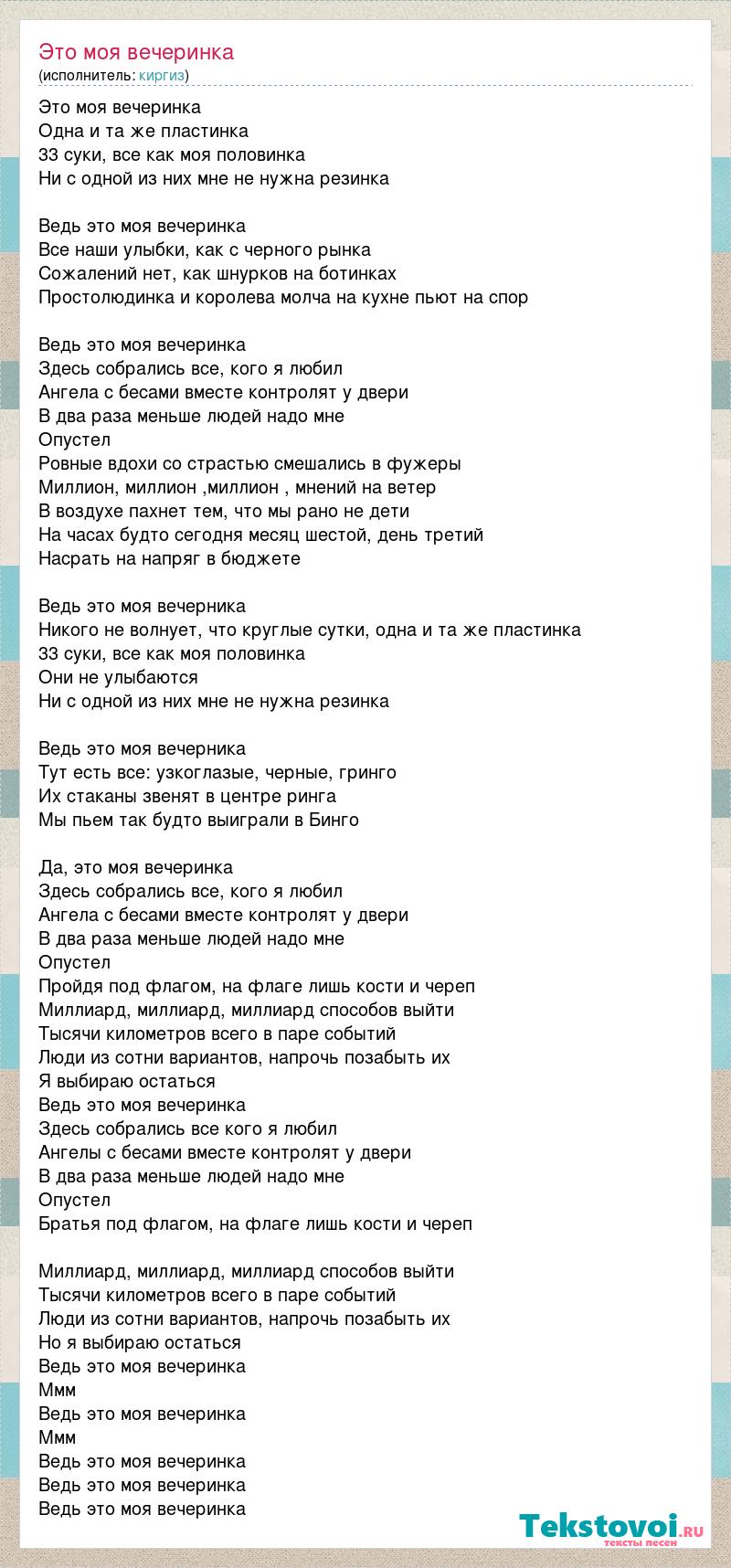 Это моя вечеринка Одна и та же пластинка 33 суки, все как моя половинка Ни с одной из них мне не нужна резинка Ведь это моя вечеринка Все наши улыбки, как с черного рынка Сожалений нет, как шнурков на ботинках Простолюдинка и королева молча на кухне пьют на спор Ведь это моя вечеринка Здесь собрались все, кого я любил Ангела с бесами вместе контролят у двери В два раза меньше людей надо мне Опустел Ровные вдохи со страстью смешались в фужеры Миллион, миллион ,миллион , мнений на ветер В воздухе пахнет тем, что мы рано не дети На часах будто сегодня месяц шестой, день третий Насрать на напряг в бюджете Ведь это моя вечерника Никого не волнует, что круглые сутки, одна и та же пластинка 33 суки, все как моя половинка Они не улыбаются Ни с одной из них мне не нужна резинка Ведь это моя вечерника Тут есть все: узкоглазые, черные, гринго Их стаканы звенят в центре ринга Мы пьем так будто выиграли в Бинго Да, это моя вечеринка Здесь собрались все, кого я любил Ангела с бесами вместе контролят у двери В два раза меньше людей надо мне Опустел Пройдя под флагом, на флаге лишь кости и череп Миллиард, миллиард, миллиард способов выйти Тысячи километров всего в паре событий Люди из сотни вариантов, напрочь позабыть их Я выбираю остаться Ведь это моя вечеринка Здесь собрались все кого я любил Ангелы с бесами вместе контролят у двери В два раза меньше людей надо мне Опустел Братья под флагом, на флаге лишь кости и череп Миллиард, миллиард, миллиард способов выйти Тысячи километров всего в паре событий Люди из сотни вариантов, напрочь позабыть их Но я выбираю остаться Ведь это моя вечеринка Ммм Ведь это моя вечеринка Ммм Ведь это моя вечеринка Ведь это моя вечеринка Ведь это моя вечеринка