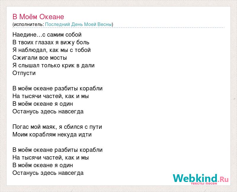 Наедине…с самим собой В твоих глазах я вижу боль Я наблюдал, как мы с тобой Сжигали все мосты Я слышал только крик в дали Отпусти В моём океане разбиты корабли На тысячи частей, как и мы В моём океане я один Останусь здесь навсегда Погас мой маяк, я сбился с пути Моим кораблям некуда идти В моём океане разбиты корабли На тысячи частей, как и мы В моём океане я один Останусь здесь навсегда