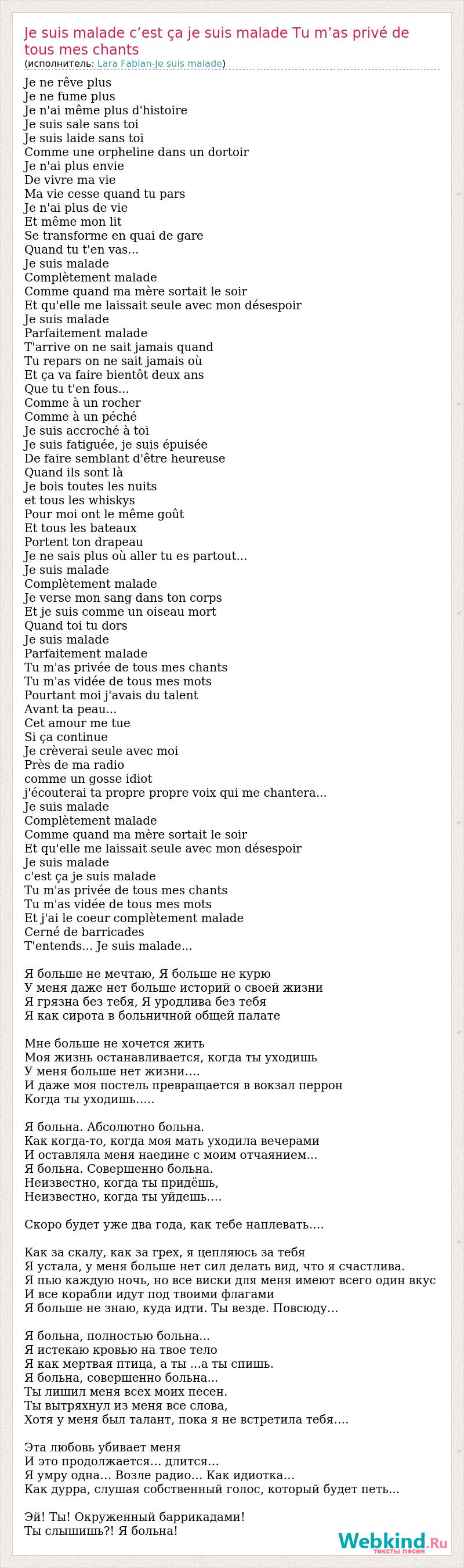 Je ne rêve plus Je ne fume plus Je n'ai même plus d'histoire Je suis sale sans toi Je suis laide sans toi Comme une orpheline dans un dortoir Je n'ai plus envie De vivre ma vie Ma vie cesse quand tu pars Je n'ai plus de vie Et même mon lit Se transforme en quai de gare Quand tu t'en vas... Je suis malade Complètement malade Comme quand ma mère sortait le soir Et qu'elle me laissait seule avec mon désespoir Je suis malade Parfaitement malade T'arrive on ne sait jamais quand Tu repars on ne sait jamais où Et ça va faire bientôt deux ans Que tu t'en fous... Comme à un rocher Comme à un péché Je suis accroché à toi Je suis fatiguée, je suis épuisée De faire semblant d'être heureuse Quand ils sont là Je bois toutes les nuits et tous les whiskys Pour moi ont le même goût Et tous les bateaux Portent ton drapeau Je ne sais plus où aller tu es partout... Je suis malade Complètement malade Je verse mon sang dans ton corps Et je suis comme un oiseau mort Quand toi tu dors Je suis malade Parfaitement malade Tu m'as privée de tous mes chants Tu m'as vidée de tous mes mots Pourtant moi j'avais du talent Avant ta peau... Cet amour me tue Si ça continue Je crèverai seule avec moi Près de ma radio comme un gosse idiot j'écouterai ta propre propre voix qui me chantera... Je suis malade Complètement malade Comme quand ma mère sortait le soir Et qu'elle me laissait seule avec mon désespoir Je suis malade c'est ça je suis malade Tu m'as privée de tous mes chants Tu m'as vidée de tous mes mots Et j'ai le coeur complètement malade Cerné de barricades T'entends... Je suis malade... Я больше не мечтаю, Я больше не курю У меня даже нет больше историй о своей жизни Я грязна без тебя, Я уродлива без тебя Я как сирота в больничной общей палате Мне больше не хочется жить Моя жизнь останавливается, когда ты уходишь У меня больше нет жизни…. И даже моя постель превращается в вокзал перрон Когда ты уходишь….. Я больна. Абсолютно больна. Как когда-то, когда моя мать уходила вечерами И оставляла меня наедине с моим отчаянием... Я больна. Совершенно больна. Неизвестно, когда ты придёшь, Неизвестно, когда ты уйдешь…. Скоро будет уже два года, как тебе наплевать…. Как за скалу, как за грех, я цепляюсь за тебя Я устала, у меня больше нет сил делать вид, что я счастлива. Я пью каждую ночь, но все виски для меня имеют всего один вкус И все корабли идут под твоими флагами Я больше не знаю, куда идти. Ты везде. Повсюду… Я больна, полностью больна... Я истекаю кровью на твое тело Я как мертвая птица, а ты ...а ты спишь. Я больна, совершенно больна... Ты лишил меня всех моих песен. Ты вытряхнул из меня все слова, Хотя у меня был талант, пока я не встретила тебя…. Эта любовь убивает меня И это продолжается… длится… Я умру одна… Возле радио… Как идиотка… Как дурра, слушая собственный голос, который будет петь... Эй! Ты! Окруженный баррикадами! Ты слышишь?! Я больна!