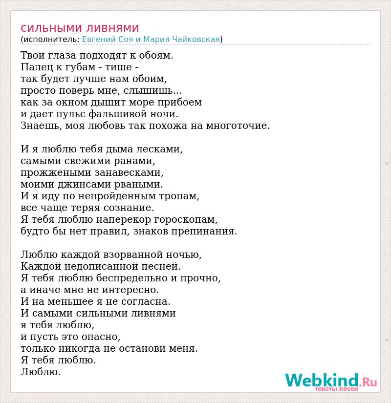 Твои глаза подходят к обоям. Палец к губам - тише - так будет лучше нам обоим, просто поверь мне, слышишь... как за окном дышит море прибоем и дает пульс фальшивой ночи. Знаешь, моя любовь так похожа на многоточие. И я люблю тебя дыма лесками, самыми свежими ранами, прожжеными занавесками, моими джинсами рваными. И я иду по непройденным тропам, все чаще теряя сознание. Я тебя люблю наперекор гороскопам, будто бы нет правил, знаков препинания. Люблю каждой взорванной ночью, Каждой недописанной песней. Я тебя люблю беспредельно и прочно, а иначе мне не интересно. И на меньшее я не согласна. И самыми сильными ливнями я тебя люблю, и пусть это опасно, только никогда не останови меня. Я тебя люблю. Люблю.