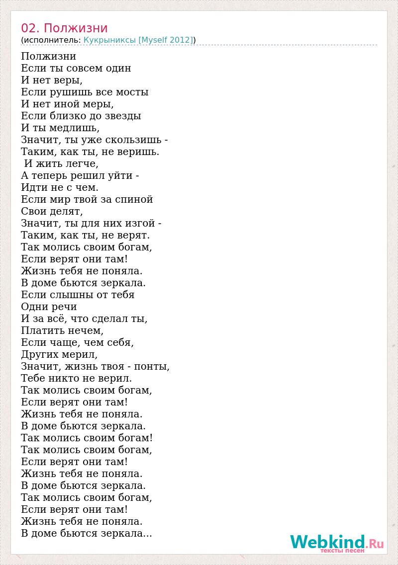 Полжизни Если ты совсем один И нет веры, Если рушишь все мосты И нет иной меры, Если близко до звезды И ты медлишь, Значит, ты уже скользишь - Таким, как ты, не веришь. И жить легче, А теперь решил уйти - Идти не с чем. Если мир твой за спиной Свои делят, Значит, ты для них изгой - Таким, как ты, не верят. Так молись своим богам, Если верят они там! Жизнь тебя не поняла. В доме бьются зеркала. Если слышны от тебя Одни речи И за всё, что сделал ты, Платить нечем, Если чаще, чем себя, Других мерил, Значит, жизнь твоя - понты, Тебе никто не верил. Так молись своим богам, Если верят они там! Жизнь тебя не поняла. В доме бьются зеркала. Так молись своим богам! Так молись своим богам, Если верят они там! Жизнь тебя не поняла. В доме бьются зеркала. Так молись своим богам, Если верят они там! Жизнь тебя не поняла. В доме бьются зеркала...