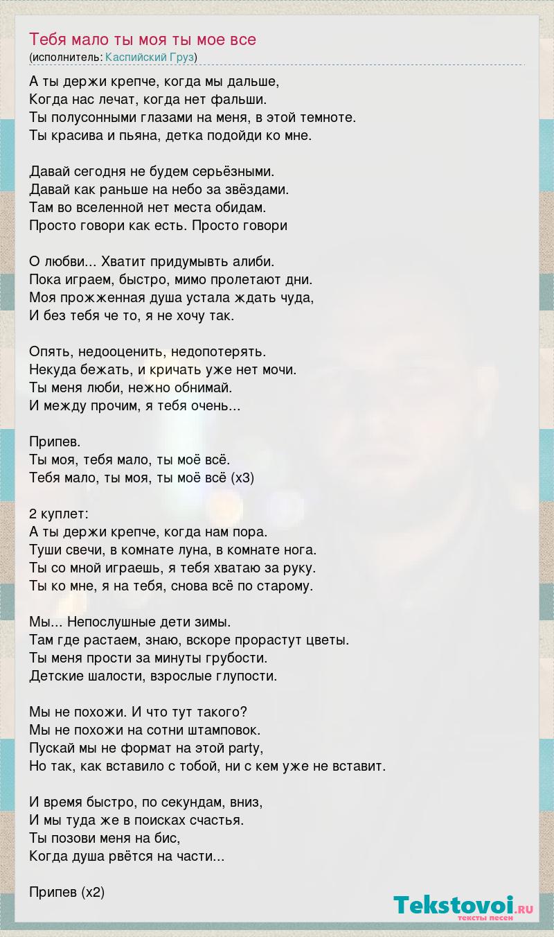 А ты держи крепче, когда мы дальше, Когда нас лечат, когда нет фальши. Ты полусонными глазами на меня, в этой темноте. Ты красива и пьяна, детка подойди ко мне. Давай сегодня не будем серьёзными. Давай как раньше на небо за звёздами. Там во вселенной нет места обидам. Просто говори как есть. Просто говори О любви... Хватит придумывть алиби. Пока играем, быстро, мимо пролетают дни. Моя прожженная душа устала ждать чуда, И без тебя че то, я не хочу так. Опять, недооценить, недопотерять. Некуда бежать, и кричать уже нет мочи. Ты меня люби, нежно обнимай. И между прочим, я тебя очень... Припев. Ты моя, тебя мало, ты моё всё. Тебя мало, ты моя, ты моё всё (х3) 2 куплет: А ты держи крепче, когда нам пора. Туши свечи, в комнате луна, в комнате нога. Ты со мной играешь, я тебя хватаю за руку. Ты ко мне, я на тебя, снова всё по старому. Мы... Непослушные дети зимы. Там где растаем, знаю, вскоре прорастут цветы. Ты меня прости за минуты грубости. Детские шалости, взрослые глупости. Мы не похожи. И что тут такого? Мы не похожи на сотни штамповок. Пускай мы не формат на этой party, Но так, как вставило с тобой, ни с кем уже не вставит. И время быстро, по секундам, вниз, И мы туда же в поисках счастья. Ты позови меня на бис, Когда душа рвётся на части... Припев (х2)