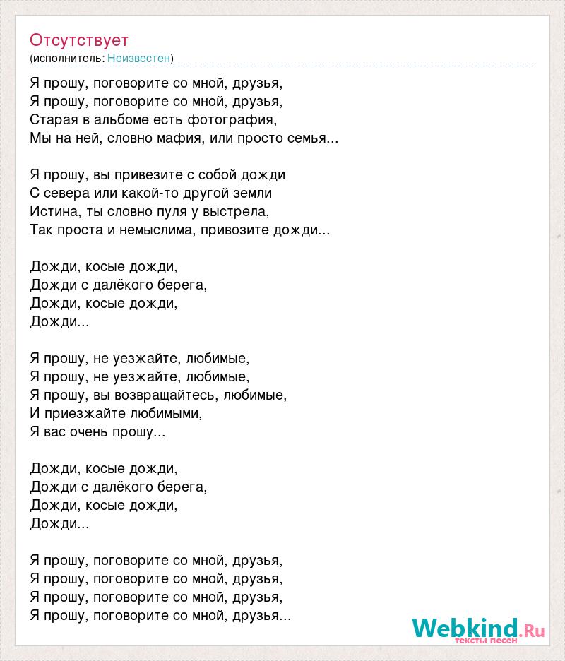 Я прошу, поговорите со мной, друзья, Я прошу, поговорите со мной, друзья, Старая в альбоме есть фотография, Мы на ней, словно мафия, или просто семья... Я прошу, вы привезите с собой дожди С севера или какой-то другой земли Истина, ты словно пуля у выстрела, Так проста и немыслима, привозите дожди... Дожди, косые дожди, Дожди с далёкого берега, Дожди, косые дожди, Дожди... Я прошу, не уезжайте, любимые, Я прошу, не уезжайте, любимые, Я прошу, вы возвращайтесь, любимые, И приезжайте любимыми, Я вас очень прошу... Дожди, косые дожди, Дожди с далёкого берега, Дожди, косые дожди, Дожди... Я прошу, поговорите со мной, друзья, Я прошу, поговорите со мной, друзья, Я прошу, поговорите со мной, друзья, Я прошу, поговорите со мной, друзья...
