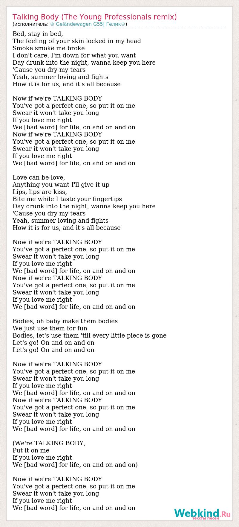 Bed, stay in bed, The feeling of your skin locked in my head Smoke smoke me broke I don't care, I'm down for what you want Day drunk into the night, wanna keep you here 'Cause you dry my tears Yeah, summer loving and fights How it is for us, and it's all because Now if we're TALKING BODY You've got a perfect one, so put it on me Swear it won't take you long If you love me right We [bad word] for life, on and on and on Now if we're TALKING BODY You've got a perfect one, so put it on me Swear it won't take you long If you love me right We [bad word] for life, on and on and on Love can be love, Anything you want I'll give it up Lips, lips are kiss, Bite me while I taste your fingertips Day drunk into the night, wanna keep you here 'Cause you dry my tears Yeah, summer loving and fights How it is for us, and it's all because Now if we're TALKING BODY You've got a perfect one, so put it on me Swear it won't take you long If you love me right We [bad word] for life, on and on and on Now if we're TALKING BODY You've got a perfect one, so put it on me Swear it won't take you long If you love me right We [bad word] for life, on and on and on Bodies, oh baby make them bodies We just use them for fun Bodies, let's use them 'till every little piece is gone Let's go! On and on and on Let's go! On and on and on Now if we're TALKING BODY You've got a perfect one, so put it on me Swear it won't take you long If you love me right We [bad word] for life, on and on and on Now if we're TALKING BODY You've got a perfect one, so put it on me Swear it won't take you long If you love me right We [bad word] for life, on and on and on (We're TALKING BODY, Put it on me If you love me right We [bad word] for life, on and on and on) Now if we're TALKING BODY You've got a perfect one, so put it on me Swear it won't take you long If you love me right We [bad word] for life, on and on and on