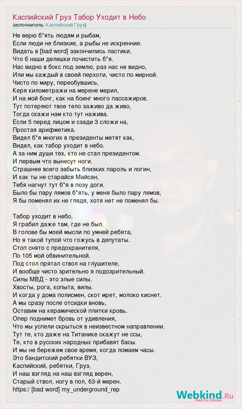 Не верю б*ять людям и рыбам, Если люди не близкие, а рыбы не искренние. Видать в [bad word] закончились ластики, Что б наши делишки почистить б*я. Нас видно в бокс под землю, раз нас не видно, Или мы каждый в своей перхоти, чисто по мирной. Чисто по миру, переобувшись, Керя километражи на мерене мерил, И на мой бонг, как на боинг много пассажиров. Тут потеряют твое тело заживо да живо, Тогда скажи нам кто тут нажива. Если 5 перед лицом и сзади 3 сложи на, Простая арифметика. Видел б*я многих в президенты метят как, Видел, как табор уходит в небо. А за ним души тех, кто не стал президентом. И первым что вынесут ноги. Страшнее всего забыть близких пароль и логин, И как ты не старайся Майсан, Тебя нагнут тут б*я в позу доги. Было бы пару лямов б*ять, у меня было пару лямов, Я бы поменял их не глядя, хотя нет не поменял бы. Табор уходит в небо, Я грабил даже там, где не был. В голове бы моей мысли по умней ребята, Но я такой тупой что гожусь в депутаты. Стоп снято с предохранителя, По 105 мой обвинительной. Под стол прятал ствол на глушителе, И вообще чисто зрительно я подозрительный. Силы МВД - это злые силы, Хвосты, рога, копыта, вилы. И когда у дома полисмен, скот мрет, молоко киснет. А мы сразу после отсидки вновь, Оставим на керамической плитки кровь. Опер поднимет бровь от удивления, Что мы успели скрыться в неизвестном направлении. Тут те, кто даже на Титанике скажут не ссы, Те, кто в русских народных прибавят басы. И мы не бережем свое время, когда ломаем часы. Это бандитский ребятки ВУЗ, Каспийский, ребятки, Груз, И наш взгляд на наш взгляд верен, Старый ствол, ногу в пол, 63-й мерен. https:/ [bad word] my_underground_rep