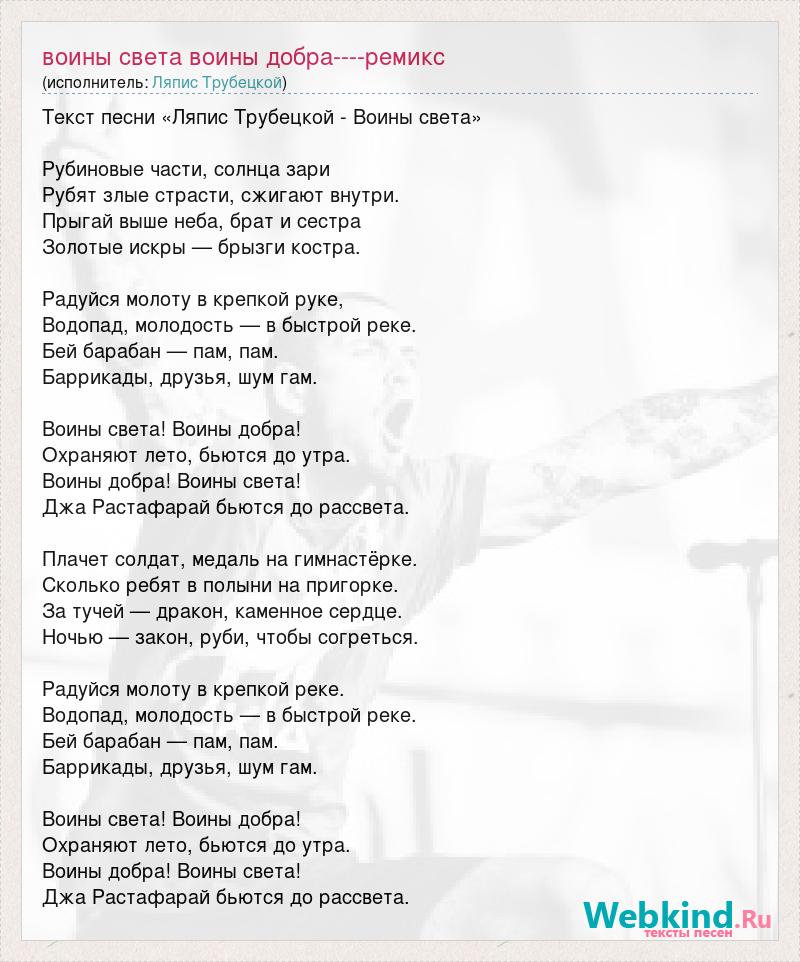 Текст песни «Ляпис Трубецкой - Воины света» Рубиновые части, солнца зари Рубят злые страсти, сжигают внутри. Прыгай выше неба, брат и сестра Золотые искры — брызги костра. Радуйся молоту в крепкой руке, Водопад, молодость — в быстрой реке. Бей барабан — пам, пам. Баррикады, друзья, шум гам. Воины света! Воины добра! Охраняют лето, бьются до утра. Воины добра! Воины света! Джа Растафарай бьются до рассвета. Плачет солдат, медаль на гимнастёрке. Сколько ребят в полыни на пригорке. За тучей — дракон, каменное сердце. Ночью — закон, руби, чтобы согреться. Радуйся молоту в крепкой реке. Водопад, молодость — в быстрой реке. Бей барабан — пам, пам. Баррикады, друзья, шум гам. Воины света! Воины добра! Охраняют лето, бьются до утра. Воины добра! Воины света! Джа Растафарай бьются до рассвета.