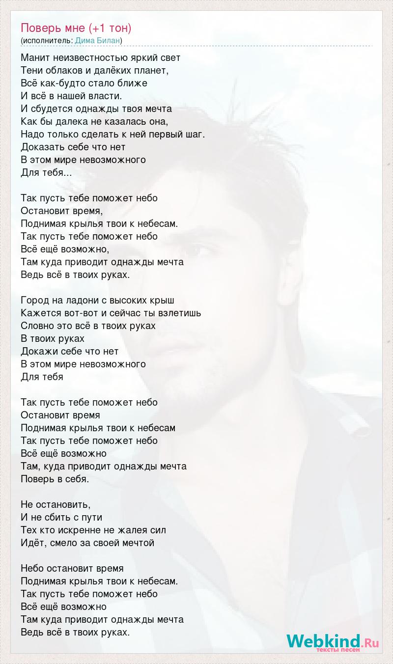 Манит неизвестностью яркий свет Тени облаков и далёких планет, Всё как-будто стало ближе И всё в нашей власти. И сбудется однажды твоя мечта Как бы далека не казалась она, Надо только сделать к ней первый шаг. Доказать себе что нет В этом мире невозможного Для тебя... Так пусть тебе поможет небо Остановит время, Поднимая крылья твои к небесам. Так пусть тебе поможет небо Всё ещё возможно, Там куда приводит однажды мечта Ведь всё в твоих руках. Город на ладони с высоких крыш Кажется вот-вот и сейчас ты взлетишь Словно это всё в твоих руках В твоих руках Докажи себе что нет В этом мире невозможного Для тебя Так пусть тебе поможет небо Остановит время Поднимая крылья твои к небесам Так пусть тебе поможет небо Всё ещё возможно Там, куда приводит однажды мечта Поверь в себя. Не остановить, И не сбить с пути Тех кто искренне не жалея сил Идёт, смело за своей мечтой Небо остановит время Поднимая крылья твои к небесам. Так пусть тебе поможет небо Всё ещё возможно Там куда приводит однажды мечта Ведь всё в твоих руках.