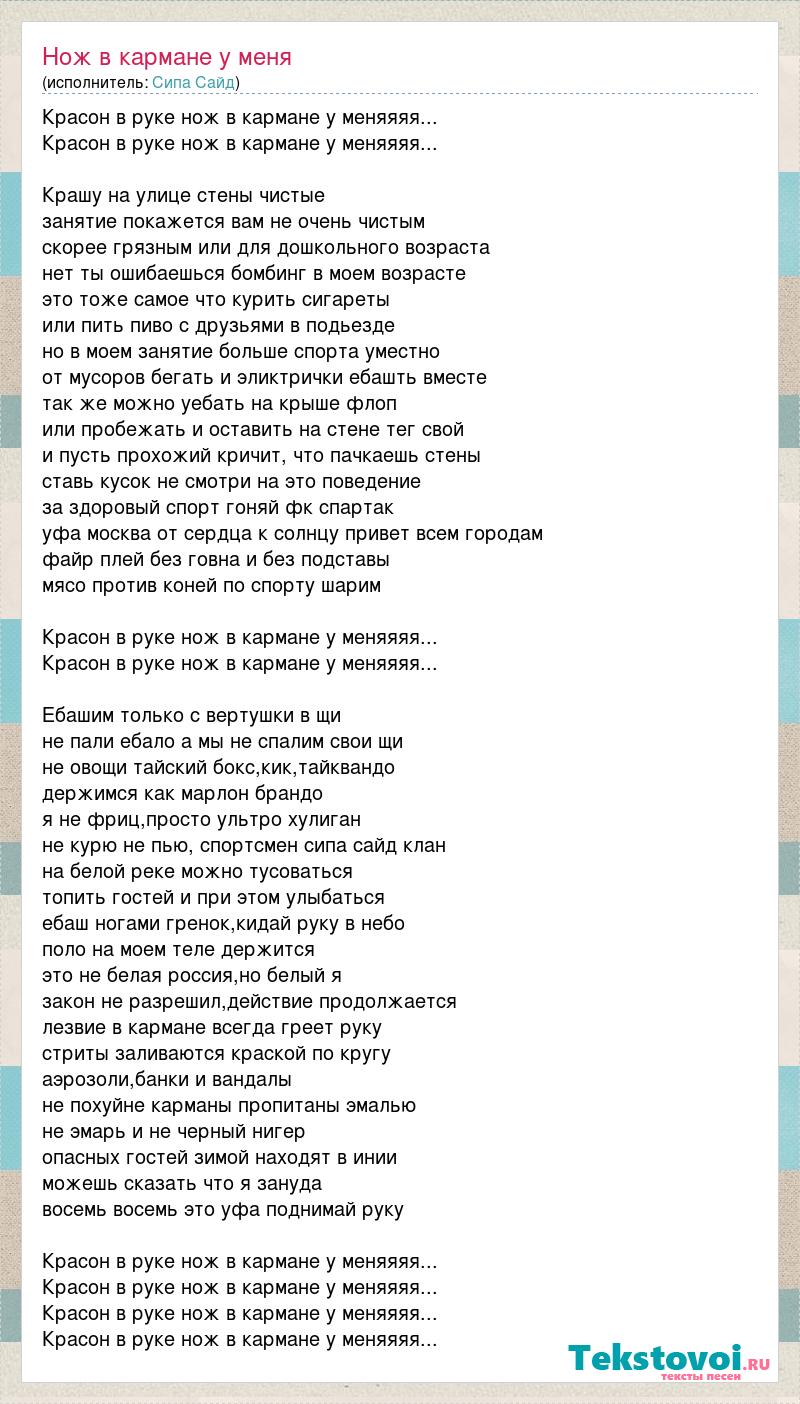 Красон в руке нож в кармане у меняяяя... Красон в руке нож в кармане у меняяяя... Крашу на улице стены чистые занятие покажется вам не очень чистым скорее грязным или для дошкольного возраста нет ты ошибаешься бомбинг в моем возрасте это тоже самое что курить сигареты или пить пиво с друзьями в подьезде но в моем занятие больше спорта уместно от мусоров бегать и эликтрички ебашть вместе так же можно уебать на крыше флоп или пробежать и оставить на стене тег свой и пусть прохожий кричит, что пачкаешь стены ставь кусок не смотри на это поведение за здоровый спорт гоняй фк спартак уфа москва от сердца к солнцу привет всем городам файр плей без говна и без подставы мясо против коней по спорту шарим Красон в руке нож в кармане у меняяяя... Красон в руке нож в кармане у меняяяя... Ебашим только с вертушки в щи не пали ебало а мы не спалим свои щи не овощи тайский бокс,кик,тайквандо держимся как марлон брандо я не фриц,просто ультро хулиган не курю не пью, спортсмен сипа сайд клан на белой реке можно тусоваться топить гостей и при этом улыбаться ебаш ногами гренок,кидай руку в небо поло на моем теле держится это не белая россия,но белый я закон не разрешил,действие продолжается лезвие в кармане всегда греет руку стриты заливаются краской по кругу аэрозоли,банки и вандалы не похуйне карманы пропитаны эмалью не эмарь и не черный нигер опасных гостей зимой находят в инии можешь сказать что я зануда восемь восемь это уфа поднимай руку Красон в руке нож в кармане у меняяяя... Красон в руке нож в кармане у меняяяя... Красон в руке нож в кармане у меняяяя... Красон в руке нож в кармане у меняяяя...