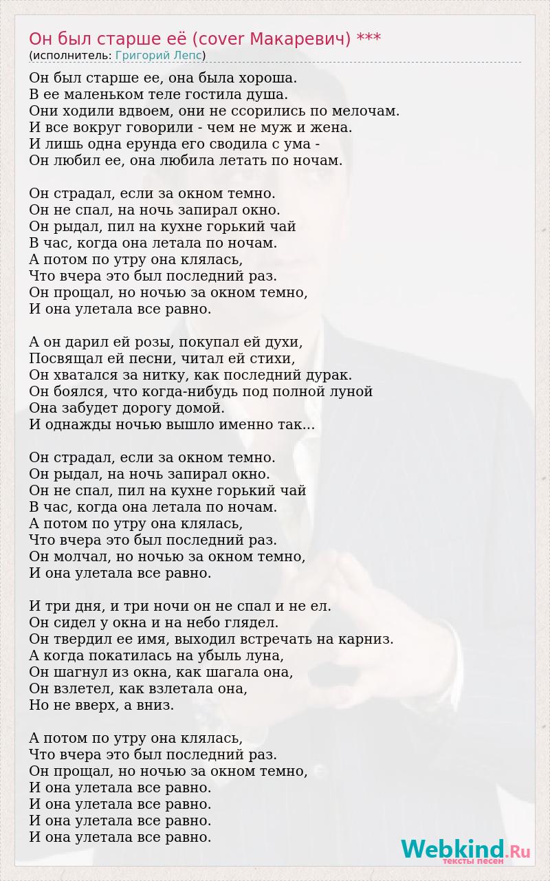 Он был старше ее, она была хороша. В ее маленьком теле гостила душа. Они ходили вдвоем, они не ссорились по мелочам. И все вокруг говорили - чем не муж и жена. И лишь одна ерунда его сводила с ума - Он любил ее, она любила летать по ночам. Он страдал, если за окном темно. Он не спал, на ночь запирал окно. Он рыдал, пил на кухне горький чай В час, когда она летала по ночам. А потом по утру она клялась, Что вчера это был последний раз. Он прощал, но ночью за окном темно, И она улетала все равно. А он дарил ей розы, покупал ей духи, Посвящал ей песни, читал ей стихи, Он хватался за нитку, как последний дурак. Он боялся, что когда-нибудь под полной луной Она забудет дорогу домой. И однажды ночью вышло именно так... Он страдал, если за окном темно. Он рыдал, на ночь запирал окно. Он не спал, пил на кухне горький чай В час, когда она летала по ночам. А потом по утру она клялась, Что вчера это был последний раз. Он молчал, но ночью за окном темно, И она улетала все равно. И три дня, и три ночи он не спал и не ел. Он сидел у окна и на небо глядел. Он твердил ее имя, выходил встречать на карниз. А когда покатилась на убыль луна, Он шагнул из окна, как шагала она, Он взлетел, как взлетала она, Но не вверх, а вниз. А потом по утру она клялась, Что вчера это был последний раз. Он прощал, но ночью за окном темно, И она улетала все равно. И она улетала все равно. И она улетала все равно. И она улетала все равно.