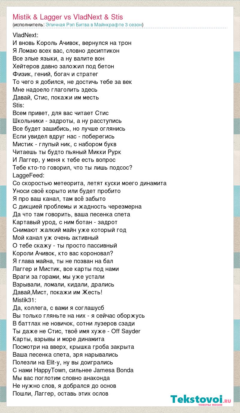 VladNext: И вновь Король Ачивок, вернулся на трон Я Ломаю всех вас, словно десиптикон Все злые языки, а ну валите вон Хейтеров давно заложил под бетон Физик, гений, богач и стратег То чего я добился, не достичь тебе за век Мне надоело глаголить здесь Давай, Стис, покажи им месть Stis: Всем привет, для вас читает Стис Школьники - задроты, а ну расступись Все будет зашибись, но лучше оглянись Если увидел вдруг нас - поберегись Мистик - глупый ник, с набором букв Читаешь ты будто пьяный Микки Рурк И Лаггер, у меня к тебе есть вопрос Тебе кто-то говорил, что ты лишь подсос? LaggeFeed: Со скоростью метеорита, летят куски моего динамита Уноси своё корыто или будет пробито Я про ваш канал, там всё забыто С дикцией проблемы и жадность черезмерна Да что там говорить, ваша песенка спета Картавый урод, с ним ботан - задрот Снимают жалкий майн уже который год Мой канал уж очень активный О тебе скажу - ты просто пассивный Короли Ачивок, кто вас короновал? Я глава майна, ты не позван на бал Лаггер и Мистик, все карты под нами Враги за горами, мы уже устали Взрывали, ломали, кидали, дрались Давай,Мист, покажи им Жесть! Mistik31: Да, коллега, с вами я соглашусб Вы только гляньте на них - я сейчас оборжусь В баттлах не новичок, сотни лузеров сзади Ты даже не Стис, твоё имя хуже - Off Sayder Карты, взрывы и море динамита Посмотри на вверх, крышка гроба закрыта Ваша песенка спета, зря нарывались Полезли на Elit-у, ну вы доигрались С нами HappyTown, сильнее Jamesа Bondа Мы вас поглотим словно анаконда Не нужно слов, я добрался до основ Пошли, Лаггер, оставь этих ослов