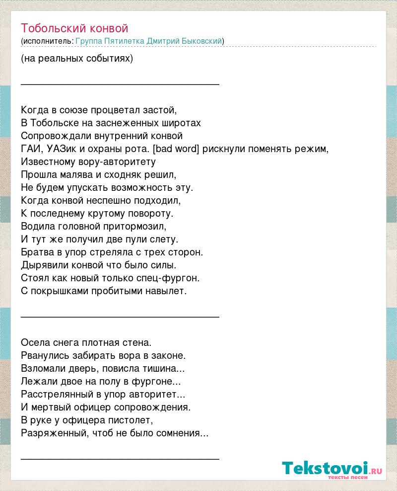 (на реальных событиях) ———————————————————— Когда в союзе процветал застой, В Тобольске на заснеженных широтах Сопровождали внутренний конвой ГАИ, УАЗик и охраны рота. [bad word] рискнули поменять режим, Известному вору-авторитету Прошла малява и сходняк решил, Не будем упускать возможность эту. Когда конвой неспешно подходил, К последнему крутому повороту. Водила головной притормозил, И тут же получил две пули слету. Братва в упор стреляла с трех сторон. Дырявили конвой что было силы. Стоял как новый только спец-фургон. С покрышками пробитыми навылет. ———————————————————— Осела снега плотная стена. Рванулись забирать вора в законе. Взломали дверь, повисла тишина... Лежали двое на полу в фургоне... Расстрелянный в упор авторитет... И мертвый офицер сопровождения. В руке у офицера пистолет, Разряженный, чтоб не было сомнения... ————————————————————