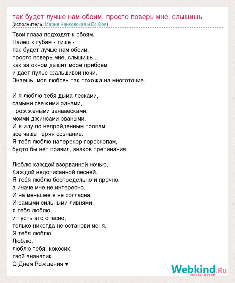 А как ты думаешь, о чем песня "Так будет лучше нам обоим, просто поверь мне, слышишь" ?