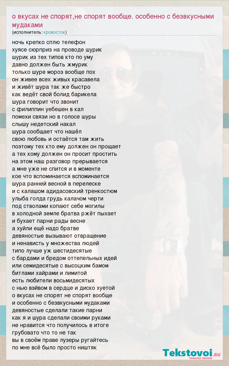 А как ты думаешь, о чем песня "О вкусах не спорят,не спорят вообще. особенно с безвкусными мудаками" ?