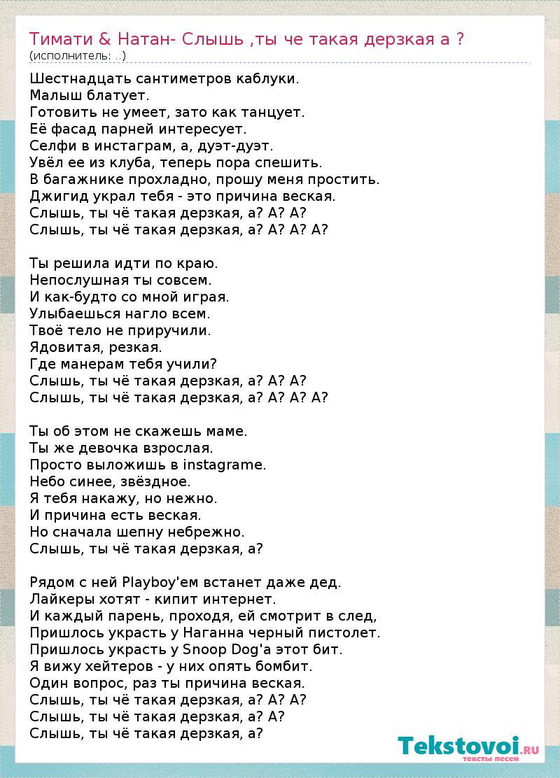 Шестнадцать сантиметров каблуки. Малыш блатует. Готовить не умеет, зато как танцует. Её фасад парней интересует. Селфи в инстаграм, а, дуэт-дуэт. Увёл ее из клуба, теперь пора спешить. В багажнике прохладно, прошу меня простить. Джигид украл тебя - это причина веская. Слышь, ты чё такая дерзкая, а? А? А? Слышь, ты чё такая дерзкая, а? А? А? А? Ты решила идти по краю. Непослушная ты совсем. И как-будто со мной играя. Улыбаешься нагло всем. Твоё тело не приручили. Ядовитая, резкая. Где манерам тебя учили? Слышь, ты чё такая дерзкая, а? А? А? Слышь, ты чё такая дерзкая, а? А? А? А? Ты об этом не скажешь маме. Ты же девочка взрослая. Просто выложишь в instagramе. Небо синее, звёздное. Я тебя накажу, но нежно. И причина есть веская. Но сначала шепну небрежно. Слышь, ты чё такая дерзкая, а? Рядом с ней Plаyboy'ем встанет даже дед. Лайкеры хотят - кипит интернет. И каждый парень, проходя, ей смотрит в след, Пришлось украсть у Наганна черный пистолет. Пришлось украсть у Snoop Dog'а этот бит. Я вижу хейтеров - у них опять бомбит. Один вопрос, раз ты причина веская. Слышь, ты чё такая дерзкая, а? А? А? Слышь, ты чё такая дерзкая, а? А? Слышь, ты чё такая дерзкая, а?