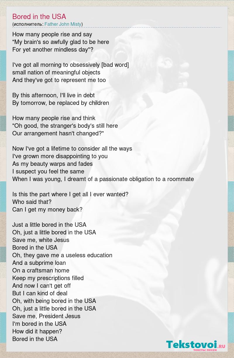 How many people rise and say "My brain's so awfully glad to be here For yet another mindless day"? I've got all morning to obsessively [bad word] small nation of meaningful objects And they've got to represent me too By this afternoon, I'll live in debt By tomorrow, be replaced by children How many people rise and think "Oh good, the stranger's body's still here Our arrangement hasn't changed?" Now I've got a lifetime to consider all the ways I've grown more disappointing to you As my beauty warps and fades I suspect you feel the same When I was young, I dreamt of a passionate obligation to a roommate Is this the part where I get all I ever wanted? Who said that? Can I get my money back? Just a little bored in the USA Oh, just a little bored in the USA Save me, white Jesus Bored in the USA Oh, they gave me a useless education And a subprime loan On a craftsman home Keep my prescriptions filled And now I can't get off But I can kind of deal Oh, with being bored in the USA Oh, just a little bored in the USA Save me, President Jesus I'm bored in the USA How did it happen? Bored in the USA