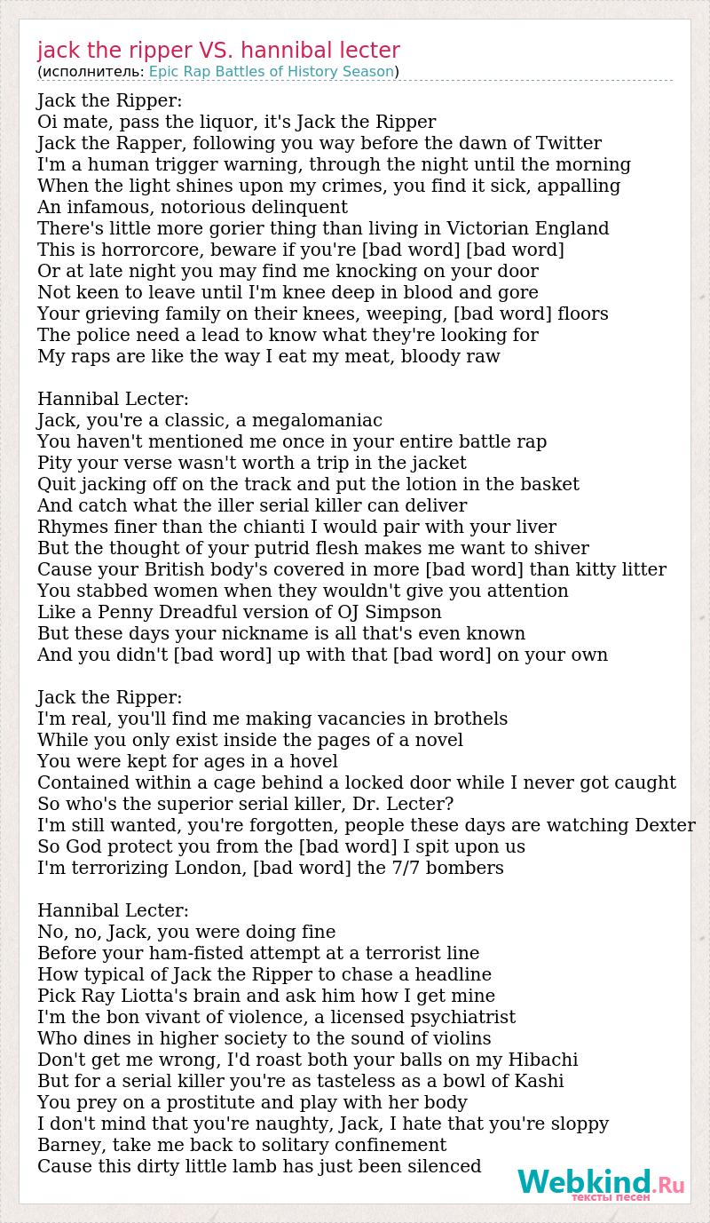 Jack the Ripper: Oi mate, pass the liquor, it's Jack the Ripper Jack the Rapper, following you way before the dawn of Twitter I'm a human trigger warning, through the night until the morning When the light shines upon my crimes, you find it sick, appalling An infamous, notorious delinquent There's little more gorier thing than living in Victorian England This is horrorcore, beware if you're [bad word] [bad word] Or at late night you may find me knocking on your door Not keen to leave until I'm knee deep in blood and gore Your grieving family on their knees, weeping, [bad word] floors The police need a lead to know what they're looking for My raps are like the way I eat my meat, bloody raw Hannibal Lecter: Jack, you're a classic, a megalomaniac You haven't mentioned me once in your entire battle rap Pity your verse wasn't worth a trip in the jacket Quit jacking off on the track and put the lotion in the basket And catch what the iller serial killer can deliver Rhymes finer than the chianti I would pair with your liver But the thought of your putrid flesh makes me want to shiver Cause your British body's covered in more [bad word] than kitty litter You stabbed women when they wouldn't give you attention Like a Penny Dreadful version of OJ Simpson But these days your nickname is all that's even known And you didn't [bad word] up with that [bad word] on your own Jack the Ripper: I'm real, you'll find me making vacancies in brothels While you only exist inside the pages of a novel You were kept for ages in a hovel Contained within a cage behind a locked door while I never got caught So who's the superior serial killer, Dr. Lecter? I'm still wanted, you're forgotten, people these days are watching Dexter So God protect you from the [bad word] I spit upon us I'm terrorizing London, [bad word] the 7/7 bombers Hannibal Lecter: No, no, Jack, you were doing fine Before your ham-fisted attempt at a terrorist line How typical of Jack the Ripper to chase a headline Pick Ray Liotta's brain and ask him how I get mine I'm the bon vivant of violence, a licensed psychiatrist Who dines in higher society to the sound of violins Don't get me wrong, I'd roast both your balls on my Hibachi But for a serial killer you're as tasteless as a bowl of Kashi You prey on a prostitute and play with her body I don't mind that you're naughty, Jack, I hate that you're sloppy Barney, take me back to solitary confinement Cause this dirty little lamb has just been silenced