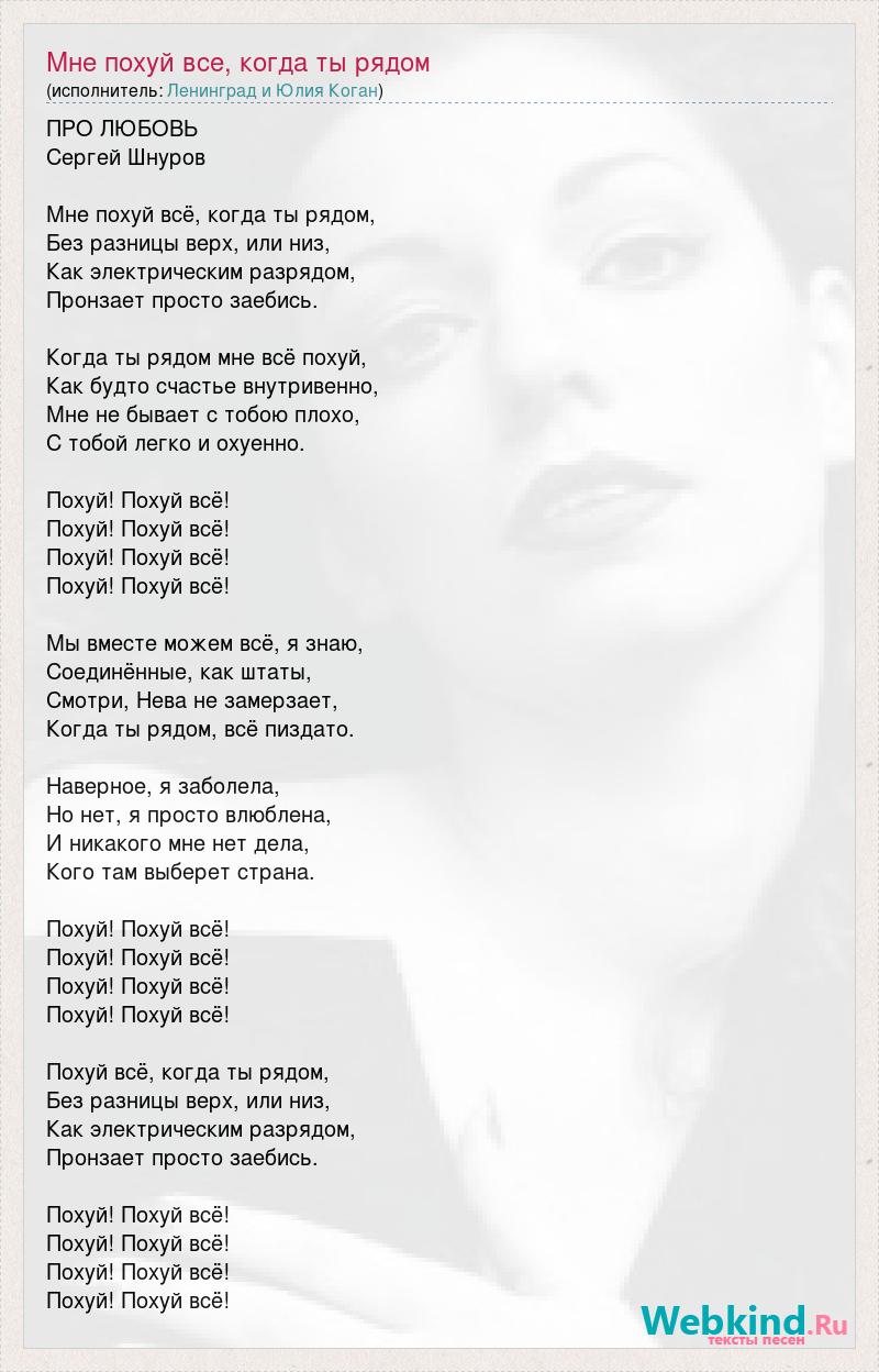 ПРО ЛЮБОВЬ Сергей Шнуров Мне похуй всё, когда ты рядом, Без разницы верх, или низ, Как электрическим разрядом, Пронзает просто заебись. Когда ты рядом мне всё похуй, Как будто счастье внутривенно, Мне не бывает с тобою плохо, С тобой легко и охуенно. Похуй! Похуй всё! Похуй! Похуй всё! Похуй! Похуй всё! Похуй! Похуй всё! Мы вместе можем всё, я знаю, Соединённые, как штаты, Смотри, Нева не замерзает, Когда ты рядом, всё пиздато. Наверное, я заболела, Но нет, я просто влюблена, И никакого мне нет дела, Кого там выберет страна. Похуй! Похуй всё! Похуй! Похуй всё! Похуй! Похуй всё! Похуй! Похуй всё! Похуй всё, когда ты рядом, Без разницы верх, или низ, Как электрическим разрядом, Пронзает просто заебись. Похуй! Похуй всё! Похуй! Похуй всё! Похуй! Похуй всё! Похуй! Похуй всё!