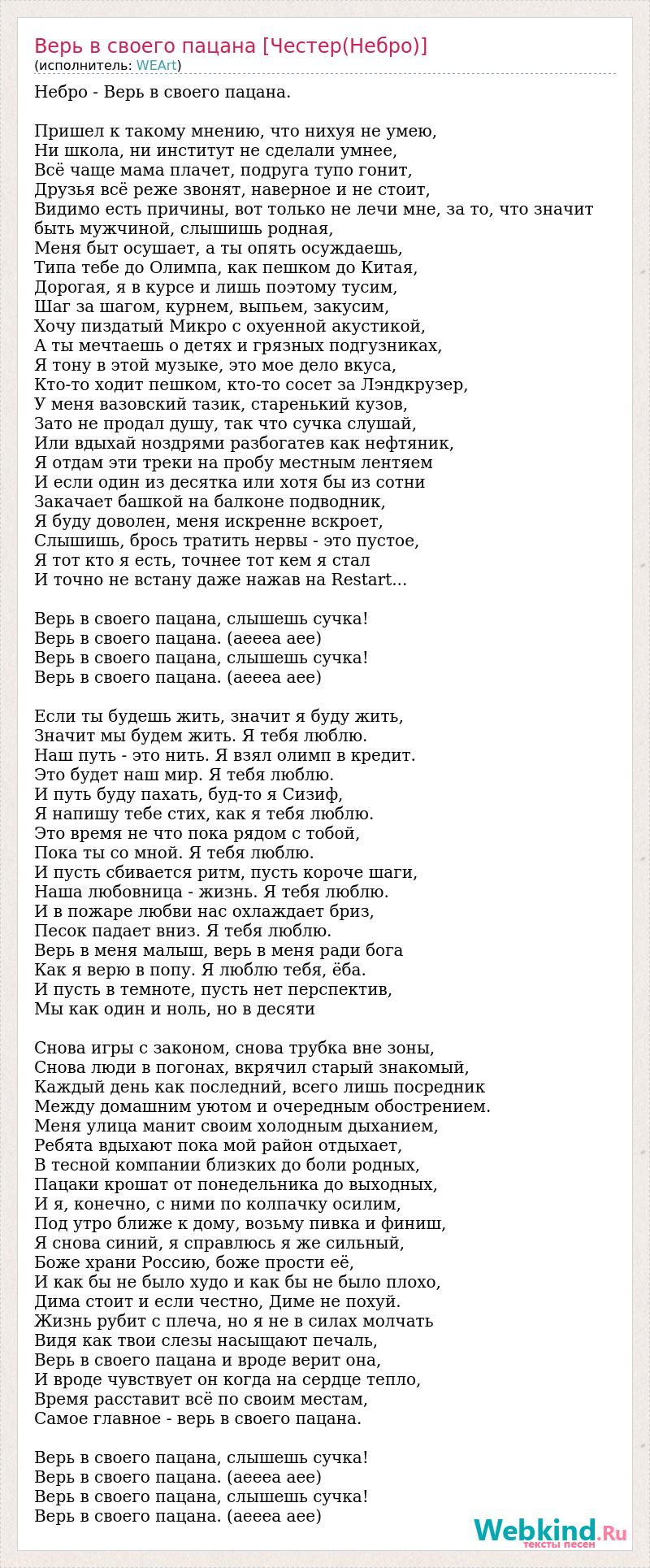 Небро - Верь в своего пацана. Пришел к такому мнению, что нихуя не умею, Ни школа, ни институт не сделали умнее, Всё чаще мама плачет, подруга тупо гонит, Друзья всё реже звонят, наверное и не стоит, Видимо есть причины, вот только не лечи мне, за то, что значит быть мужчиной, слышишь родная, Меня быт осушает, а ты опять осуждаешь, Типа тебе до Олимпа, как пешком до Китая, Дорогая, я в курсе и лишь поэтому тусим, Шаг за шагом, курнем, выпьем, закусим, Хочу пиздатый Микро с охуенной акустикой, А ты мечтаешь о детях и грязных подгузниках, Я тону в этой музыке, это мое дело вкуса, Кто-то ходит пешком, кто-то сосет за Лэндкрузер, У меня вазовский тазик, старенький кузов, Зато не продал душу, так что сучка слушай, Или вдыхай ноздрями разбогатев как нефтяник, Я отдам эти треки на пробу местным лентяем И если один из десятка или хотя бы из сотни Закачает башкой на балконе подводник, Я буду доволен, меня искренне вскроет, Слышишь, брось тратить нервы - это пустое, Я тот кто я есть, точнее тот кем я стал И точно не встану даже нажав на Restart... Верь в своего пацана, слышешь сучка! Верь в своего пацана. (аеееа аее) Верь в своего пацана, слышешь сучка! Верь в своего пацана. (аеееа аее) Если ты будешь жить, значит я буду жить, Значит мы будем жить. Я тебя люблю. Наш путь - это нить. Я взял олимп в кредит. Это будет наш мир. Я тебя люблю. И путь буду пахать, буд-то я Сизиф, Я напишу тебе стих, как я тебя люблю. Это время не что пока рядом с тобой, Пока ты со мной. Я тебя люблю. И пусть сбивается ритм, пусть короче шаги, Наша любовница - жизнь. Я тебя люблю. И в пожаре любви нас охлаждает бриз, Песок падает вниз. Я тебя люблю. Верь в меня малыш, верь в меня ради бога Как я верю в попу. Я люблю тебя, ёба. И пусть в темноте, пусть нет перспектив, Мы как один и ноль, но в десяти Снова игры с законом, снова трубка вне зоны, Снова люди в погонах, вкрячил старый знакомый, Каждый день как последний, всего лишь посредник Между домашним уютом и очередным обострением. Меня улица манит своим холодным дыханием, Ребята вдыхают пока мой район отдыхает, В тесной компании близких до боли родных, Пацаки крошат от понедельника до выходных, И я, конечно, с ними по колпачку осилим, Под утро ближе к дому, возьму пивка и финиш, Я снова синий, я справлюсь я же сильный, Боже храни Россию, боже прости её, И как бы не было худо и как бы не было плохо, Дима стоит и если честно, Диме не похуй. Жизнь рубит с плеча, но я не в силах молчать Видя как твои слезы насыщают печаль, Верь в своего пацана и вроде верит она, И вроде чувствует он когда на сердце тепло, Время расставит всё по своим местам, Самое главное - верь в своего пацана. Верь в своего пацана, слышешь сучка! Верь в своего пацана. (аеееа аее) Верь в своего пацана, слышешь сучка! Верь в своего пацана. (аеееа аее)