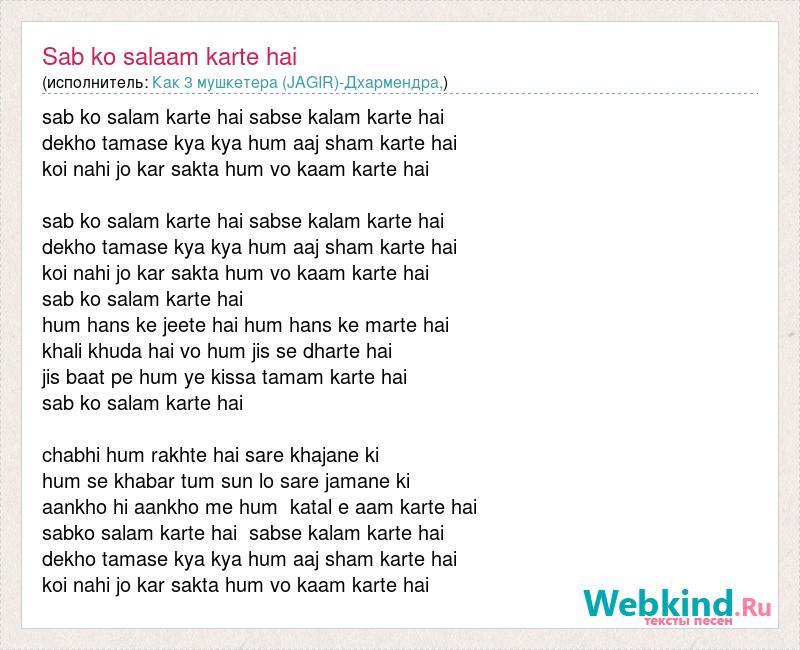 sab ko salam karte hai sabse kalam karte hai dekho tamase kya kya hum aaj sham karte hai koi nahi jo kar sakta hum vo kaam karte hai sab ko salam karte hai sabse kalam karte hai dekho tamase kya kya hum aaj sham karte hai koi nahi jo kar sakta hum vo kaam karte hai sab ko salam karte hai hum hans ke jeete hai hum hans ke marte hai khali khuda hai vo hum jis se dharte hai jis baat pe hum ye kissa tamam karte hai sab ko salam karte hai chabhi hum rakhte hai sare khajane ki hum se khabar tum sun lo sare jamane ki aankho hi aankho me hum katal e aam karte hai sabko salam karte hai sabse kalam karte hai dekho tamase kya kya hum aaj sham karte hai koi nahi jo kar sakta hum vo kaam karte hai