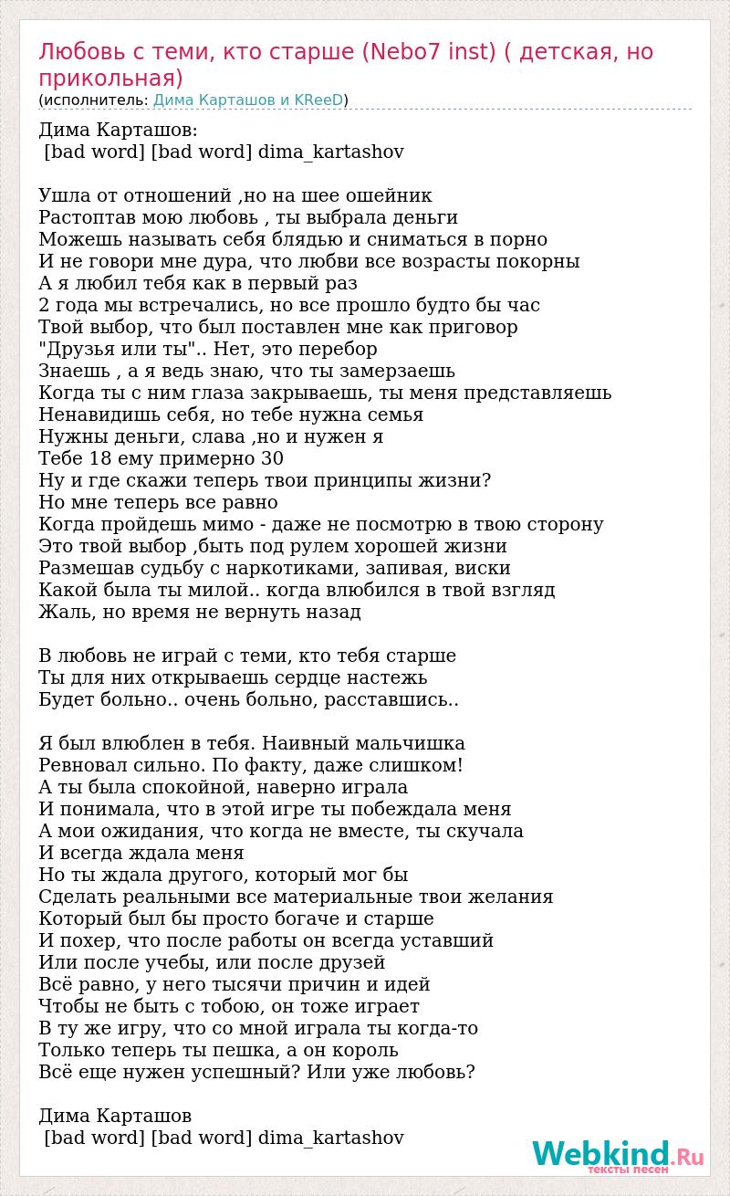 Главная→Исполнители→Дима Карташов и KReeD→Любовь с теми, кто старше (Nebo7 inst) ( детская, но прикольная)