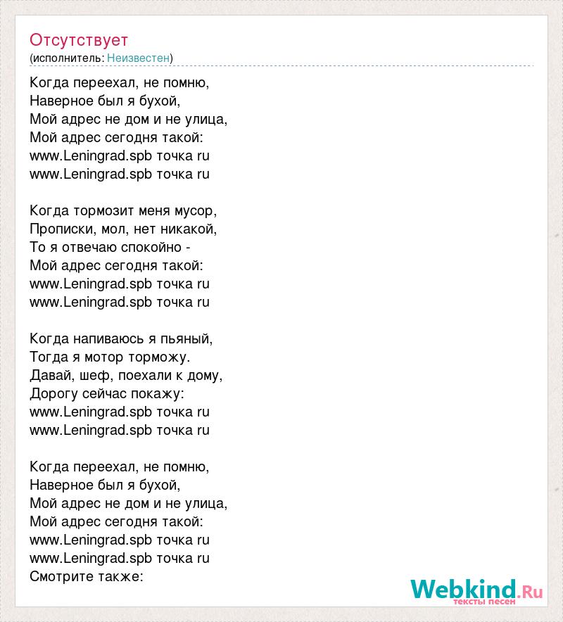 Когда переехал, не помню, Наверное был я бухой, Мой адрес не дом и не улица, Мой адрес сегодня такой: www.Leningrad.spb точка ru www.Leningrad.spb точка ru Когда тормозит меня мусор, Прописки, мол, нет никакой, То я отвечаю спокойно - Мой адрес сегодня такой: www.Leningrad.spb точка ru www.Leningrad.spb точка ru Когда напиваюсь я пьяный, Тогда я мотор торможу. Давай, шеф, поехали к дому, Дорогу сейчас покажу: www.Leningrad.spb точка ru www.Leningrad.spb точка ru Когда переехал, не помню, Наверное был я бухой, Мой адрес не дом и не улица, Мой адрес сегодня такой: www.Leningrad.spb точка ru www.Leningrad.spb точка ru Смотрите также: