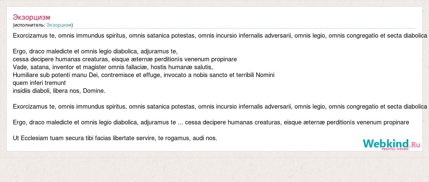Exorcizamus te, omnis immundus spiritus, omnis satanica potestas, omnis incursio infernalis adversarii, omnis legio, omnis congregatio et secta diabolica Ergo, draco maledicte et omnis legio diabolica, adjuramus te, cessa decipere humanas creaturas, eisque æternæ perditionìs venenum propinare Vade, satana, inventor et magister omnis fallaciæ, hostis humanæ salutis, Humiliare sub potenti manu Dei, contremisce et effuge, invocato a nobis sancto et terribili Nomini quem inferi tremunt insidiis diaboli, libera nos, Domine. Exorcizamus te, omnis immundus spiritus, omnis satanica potestas, omnis incursio infernalis adversarii, omnis legio, omnis congregatio et secta diabolica Ergo, draco maledicte et omnis legio diabolica, adjuramus te ... cessa decipere humanas creaturas, eisque æternæ perditionìs venenum propinare Ut Ecclesiam tuam secura tibi facias libertate servire, te rogamus, audi nos.