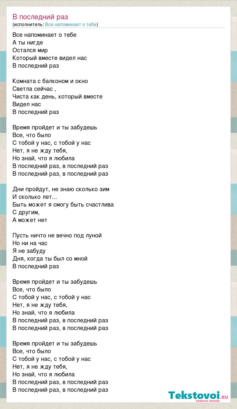 Все напоминает о тебе А ты нигде Остался мир Который вместе видел нас В последний раз Комната с балконом и окно Светла сейчас , Чиста как день, который вместе Видел нас В последний раз Время пройдет и ты забудешь Все, что было С тобой у нас, с тобой у нас Нет, я не жду тебя, Но знай, что я любила В последний раз, в последний раз В последний раз, в последний раз Дни пройдут, не знаю сколько зим И сколько лет... Быть может я смогу быть счастлива С другим, А может нет Пусть ничто не вечно под луной Но ни на час Я не забуду Дня, когда ты был со мной В последний раз Время пройдет и ты забудешь Все, что было С тобой у нас, с тобой у нас Нет, я не жду тебя, Но знай, что я любила В последний раз, в последний раз В последний раз, в последний раз Время пройдет и ты забудешь Все, что было С тобой у нас, с тобой у нас Нет, я не жду тебя, Но знай, что я любила В последний раз, в последний раз В последний раз, в последний раз