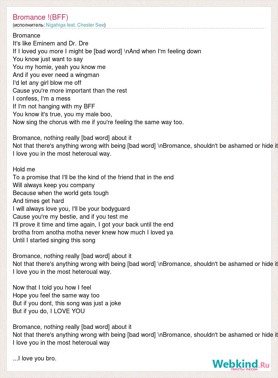 Bromance It's like Eminem and Dr. Dre If I loved you more I might be [bad word] \nAnd when I'm feeling down You know just want to say You my homie, yeah you know me And if you ever need a wingman I'd let any girl blow me off Cause you're more important than the rest I confess, I'm a mess If I'm not hanging with my BFF You know it's true, you my male boo, Now sing the chorus with me if you're feeling the same way too. Bromance, nothing really [bad word] about it Not that there's anything wrong with being [bad word] \nBromance, shouldn't be ashamed or hide it I love you in the most heteroual way. Hold me To a promise that I'll be the kind of the friend that in the end Will always keep you company Because when the world gets tough And times get hard I will always love you, I'll be your bodyguard Cause you're my bestie, and if you test me I'll prove it time and time again, I got your back until the end brotha from anotha motha never knew how much I loved ya Until I started singing this song Bromance, nothing really [bad word] about it Not that there's anything wrong with being [bad word] \nBromance, shouldn't be ashamed or hide it I love you in the most heteroual way. Now that I told you how I feel Hope you feel the same way too But if you dont, this song was just a joke But if you do, I LOVE YOU Bromance, nothing really [bad word] about it Not that there's anything wrong with being [bad word] \nBromance, shouldn't be ashamed or hide it I love you in the most heteroual way ...I love you bro.