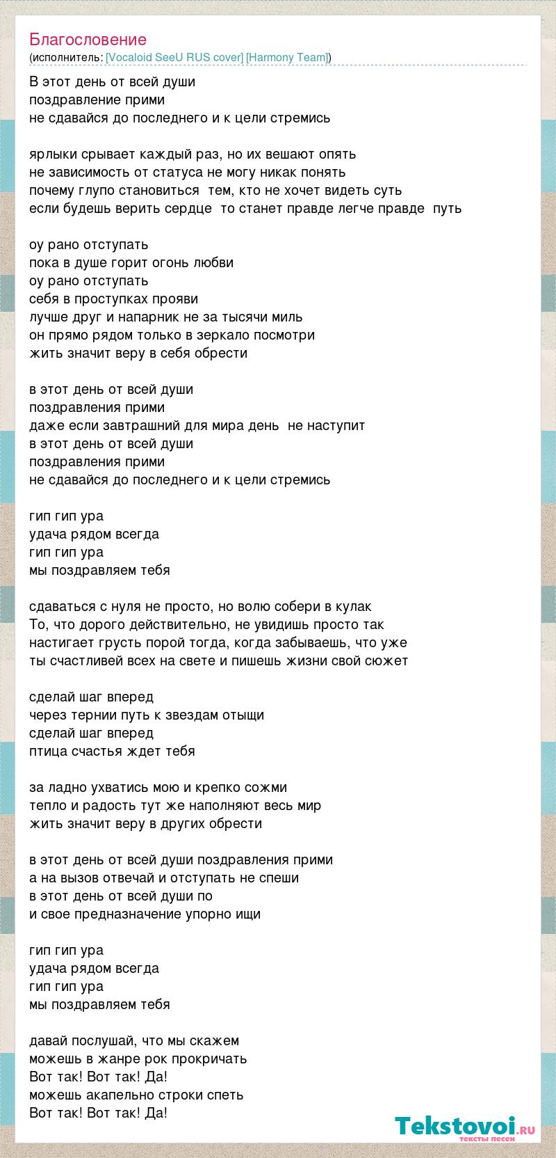 В этот день от всей души поздравление прими не сдавайся до последнего и к цели стремись ярлыки срывает каждый раз, но их вешают опять не зависимость от статуса не могу никак понять почему глупо становиться тем, кто не хочет видеть суть если будешь верить сердце то станет правде легче правде путь оу рано отступать пока в душе горит огонь любви оу рано отступать себя в проступках прояви лучше друг и напарник не за тысячи миль он прямо рядом только в зеркало посмотри жить значит веру в себя обрести в этот день от всей души поздравления прими даже если завтрашний для мира день не наступит в этот день от всей души поздравления прими не сдавайся до последнего и к цели стремись гип гип ура удача рядом всегда гип гип ура мы поздравляем тебя сдаваться с нуля не просто, но волю собери в кулак То, что дорого действительно, не увидишь просто так настигает грусть порой тогда, когда забываешь, что уже ты счастливей всех на свете и пишешь жизни свой сюжет сделай шаг вперед через тернии путь к звездам отыщи сделай шаг вперед птица счастья ждет тебя за ладно ухватись мою и крепко сожми тепло и радость тут же наполняют весь мир жить значит веру в других обрести в этот день от всей души поздравления прими а на вызов отвечай и отступать не спеши в этот день от всей души по и свое предназначение упорно ищи гип гип ура удача рядом всегда гип гип ура мы поздравляем тебя давай послушай, что мы скажем можешь в жанре рок прокричать Вот так! Вот так! Да! можешь акапельно строки спеть Вот так! Вот так! Да!