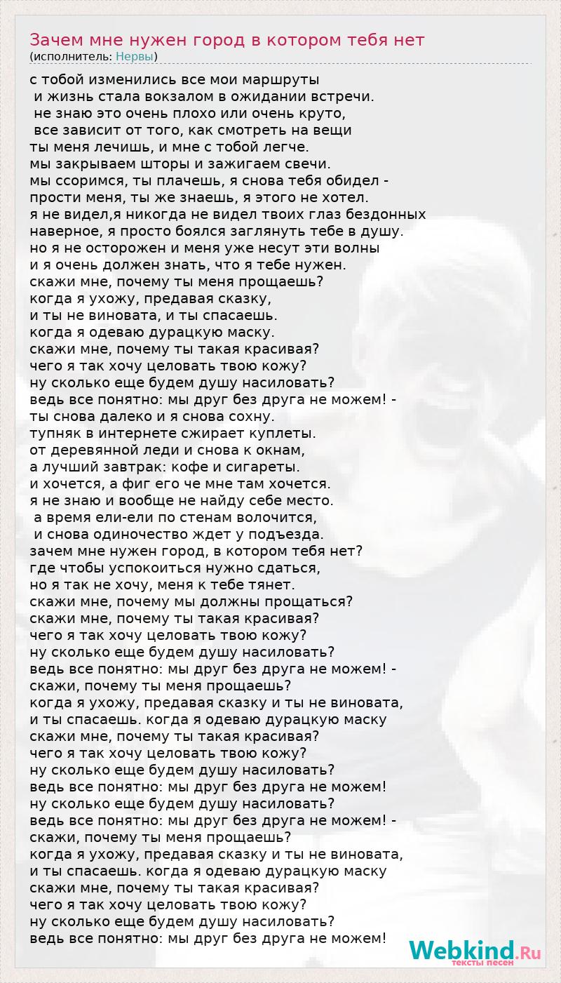 с тобой изменились все мои маршруты и жизнь стала вокзалом в ожидании встречи. не знаю это очень плохо или очень круто, все зависит от того, как смотреть на вещи ты меня лечишь, и мне с тобой легче. мы закрываем шторы и зажигаем свечи. мы ссоримся, ты плачешь, я снова тебя обидел - прости меня, ты же знаешь, я этого не хотел. я не видел,я никогда не видел твоих глаз бездонных наверное, я просто боялся заглянуть тебе в душу. но я не осторожен и меня уже несут эти волны и я очень должен знать, что я тебе нужен. скажи мне, почему ты меня прощаешь? когда я ухожу, предавая сказку, и ты не виновата, и ты спасаешь. когда я одеваю дурацкую маску. скажи мне, почему ты такая красивая? чего я так хочу целовать твою кожу? ну сколько еще будем душу насиловать? ведь все понятно: мы друг без друга не можем! - ты снова далеко и я снова сохну. тупняк в интернете сжирает куплеты. от деревянной леди и снова к окнам, а лучший завтрак: кофе и сигареты. и хочется, а фиг его че мне там хочется. я не знаю и вообще не найду себе место. а время ели-ели по стенам волочится, и снова одиночество ждет у подъезда. зачем мне нужен город, в котором тебя нет? где чтобы успокоиться нужно сдаться, но я так не хочу, меня к тебе тянет. скажи мне, почему мы должны прощаться? скажи мне, почему ты такая красивая? чего я так хочу целовать твою кожу? ну сколько еще будем душу насиловать? ведь все понятно: мы друг без друга не можем! - скажи, почему ты меня прощаешь? когда я ухожу, предавая сказку и ты не виновата, и ты спасаешь. когда я одеваю дурацкую маску скажи мне, почему ты такая красивая? чего я так хочу целовать твою кожу? ну сколько еще будем душу насиловать? ведь все понятно: мы друг без друга не можем! ну сколько еще будем душу насиловать? ведь все понятно: мы друг без друга не можем! - скажи, почему ты меня прощаешь? когда я ухожу, предавая сказку и ты не виновата, и ты спасаешь. когда я одеваю дурацкую маску скажи мне, почему ты такая красивая? чего я так хочу целовать твою кожу? ну сколько еще будем душу насиловать? ведь все понятно: мы друг без друга не можем!