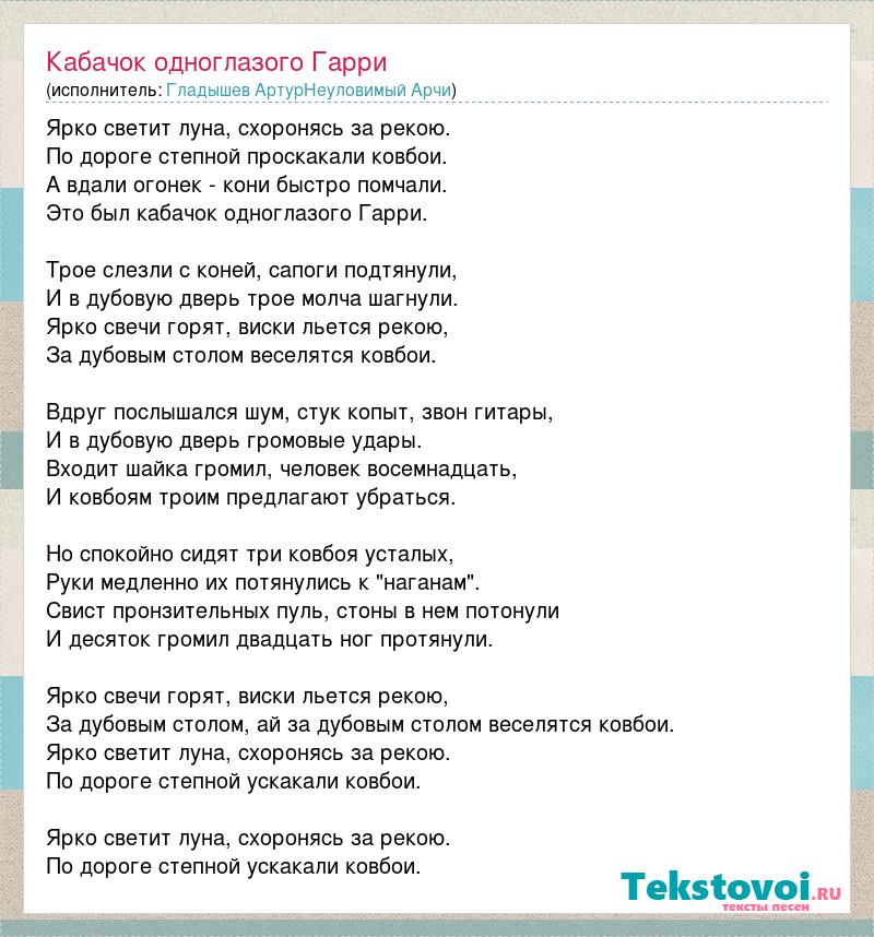 Ярко светит луна, схоронясь за рекою. По дороге степной проскакали ковбои. А вдали огонек - кони быстро помчали. Это был кабачок одноглазого Гарри. Трое слезли с коней, сапоги подтянули, И в дубовую дверь трое молча шагнули. Ярко свечи горят, виски льется рекою, За дубовым столом веселятся ковбои. Вдруг послышался шум, стук копыт, звон гитары, И в дубовую дверь громовые удары. Входит шайка громил, человек восемнадцать, И ковбоям троим предлагают убраться. Но спокойно сидят три ковбоя усталых, Руки медленно их потянулись к "наганам". Свист пронзительных пуль, стоны в нем потонули И десяток громил двадцать ног протянули. Ярко свечи горят, виски льется рекою, За дубовым столом, ай за дубовым столом веселятся ковбои. Ярко светит луна, схоронясь за рекою. По дороге степной ускакали ковбои. Ярко светит луна, схоронясь за рекою. По дороге степной ускакали ковбои.