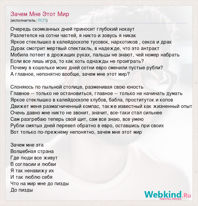 Очередь скомканных дней приносит глубокий нокаут Разлетелся на сотни частей, я никто и зовусь я никак Яркое стеклышко в калейдоскопе тусовок, наркотиков , секса и драк Дурак смотрит мертвый спектакль, в надежде, что это антракт Мобила потеет в дрожащих руках, пальцы не знают, чей номер набрать Если все лишь игра, то как хоть однажды не проиграть? Почему в кошельке моих дней сотни евро сменили пустые рубли? А главное, непонятно вообще, зачем мне этот мир? Слоняюсь по пыльной столице, разменивая свою юность Главное -- только не остановиться, главное -- только не начинать думать Яркое стеклышко в калейдоскопе клубов, бабла, проституток и копов Движет меня размагниченный компас, также известный как жизненный опыт Очень давно мне никто не звонит, значит, все-таки стал сильнее Сам разгребаю теперь свой щит, сам все знаю, все умею Рубли смятых дней перевел обратно в евро, оставшись при своих Вот только по-прежнему непонятно, зачем мне этот мир Зачем мне эта Волшебная страна Где люди все живут В согласии и любви Я так ненавижу их И так люблю себя Что на мир мне до пизды До пизды
