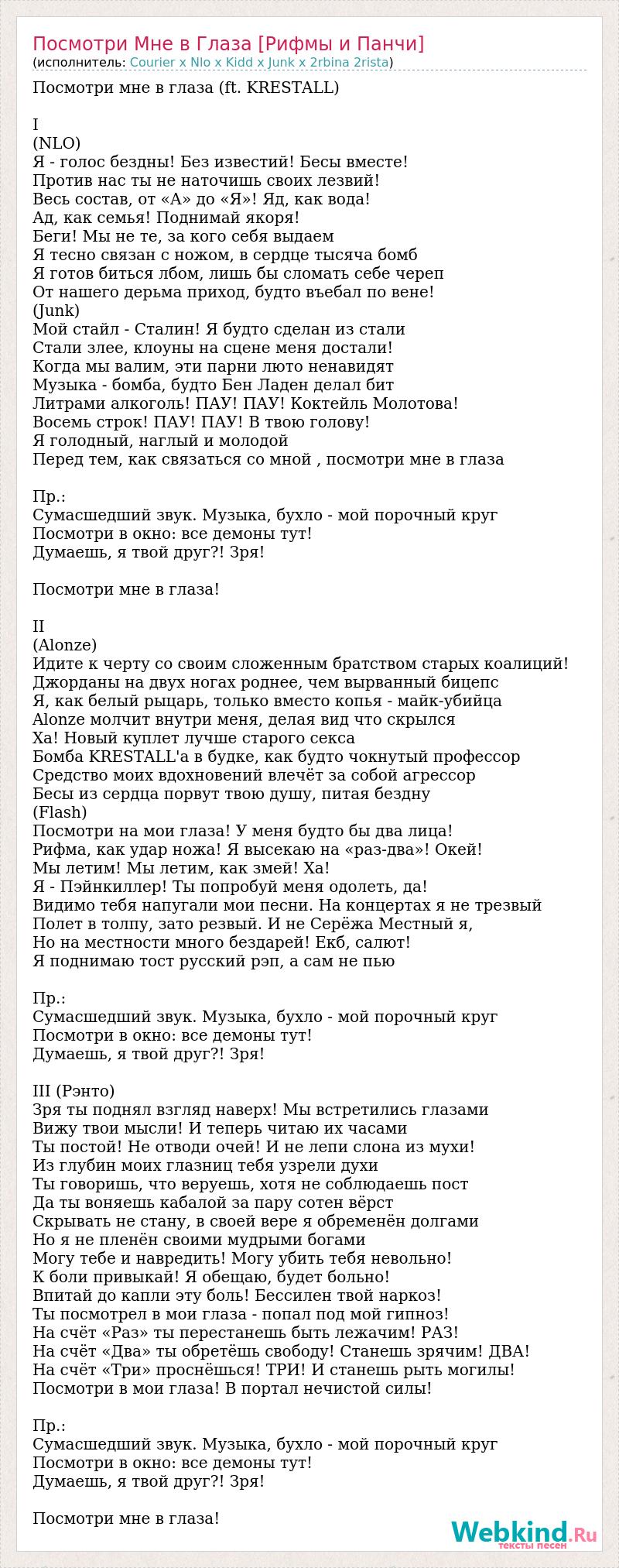 Посмотри мне в глаза (ft. KRESTALL) I (NLO) Я - голос бездны! Без известий! Бесы вместе! Против нас ты не наточишь своих лезвий! Весь состав, от «А» до «Я»! Яд, как вода! Ад, как семья! Поднимай якоря! Беги! Мы не те, за кого себя выдаем Я тесно связан с ножом, в сердце тысяча бомб Я готов биться лбом, лишь бы сломать себе череп От нашего дерьма приход, будто въебал по вене! (Junk) Мой стайл - Сталин! Я будто сделан из стали Стали злее, клоуны на сцене меня достали! Когда мы валим, эти парни люто ненавидят Музыка - бомба, будто Бен Ладен делал бит Литрами алкоголь! ПАУ! ПАУ! Коктейль Молотова! Восемь строк! ПАУ! ПАУ! В твою голову! Я голодный, наглый и молодой Перед тем, как связаться со мной , посмотри мне в глаза Пр.: Сумасшедший звук. Музыка, бухло - мой порочный круг Посмотри в окно: все демоны тут! Думаешь, я твой друг?! Зря! Посмотри мне в глаза! II (Alonze) Идите к черту со своим сложенным братством старых коалиций! Джорданы на двух ногах роднее, чем вырванный бицепс Я, как белый рыцарь, только вместо копья - майк-убийца Alonze молчит внутри меня, делая вид что скрылся Ха! Новый куплет лучше старого секса Бомба KRESTALL'а в будке, как будто чокнутый профессор Средство моих вдохновений влечёт за собой агрессор Бесы из сердца порвут твою душу, питая бездну (Flash) Посмотри на мои глаза! У меня будто бы два лица! Рифма, как удар ножа! Я высекаю на «раз-два»! Окей! Мы летим! Мы летим, как змей! Ха! Я - Пэйнкиллер! Ты попробуй меня одолеть, да! Видимо тебя напугали мои песни. На концертах я не трезвый Полет в толпу, зато резвый. И не Серёжа Местный я, Но на местности много бездарей! Екб, салют! Я поднимаю тост русский рэп, а сам не пью Пр.: Сумасшедший звук. Музыка, бухло - мой порочный круг Посмотри в окно: все демоны тут! Думаешь, я твой друг?! Зря! III (Рэнто) Зря ты поднял взгляд наверх! Мы встретились глазами Вижу твои мысли! И теперь читаю их часами Ты постой! Не отводи очей! И не лепи слона из мухи! Из глубин моих глазниц тебя узрели духи Ты говоришь, что веруешь, хотя не соблюдаешь пост Да ты воняешь кабалой за пару сотен вёрст Скрывать не стану, в своей вере я обременён долгами Но я не пленён своими мудрыми богами Могу тебе и навредить! Могу убить тебя невольно! К боли привыкай! Я обещаю, будет больно! Впитай до капли эту боль! Бессилен твой наркоз! Ты посмотрел в мои глаза - попал под мой гипноз! На счёт «Раз» ты перестанешь быть лежачим! РАЗ! На счёт «Два» ты обретёшь свободу! Станешь зрячим! ДВА! На счёт «Три» проснёшься! ТРИ! И станешь рыть могилы! Посмотри в мои глаза! В портал нечистой силы! Пр.: Сумасшедший звук. Музыка, бухло - мой порочный круг Посмотри в окно: все демоны тут! Думаешь, я твой друг?! Зря! Посмотри мне в глаза!